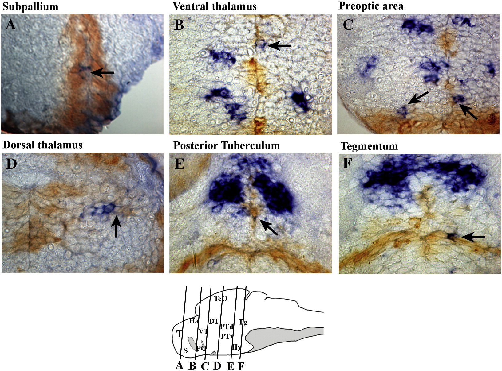 Fig. 6 Compared expression of NR4A2b and PCNA in the zebrafish larval brain. Double staining for NR4A2b transcripts (in situ hybridization, blue staining) and PCNA protein (immunocytochemistry, brown) in the brain at 72 hpf on paraffin sections. All views are cross-sections, dorsal to the top, in order along the antero-posterior axis as indicated on the schematic (bottom panel). Black arrows indicate cellular co-expression.