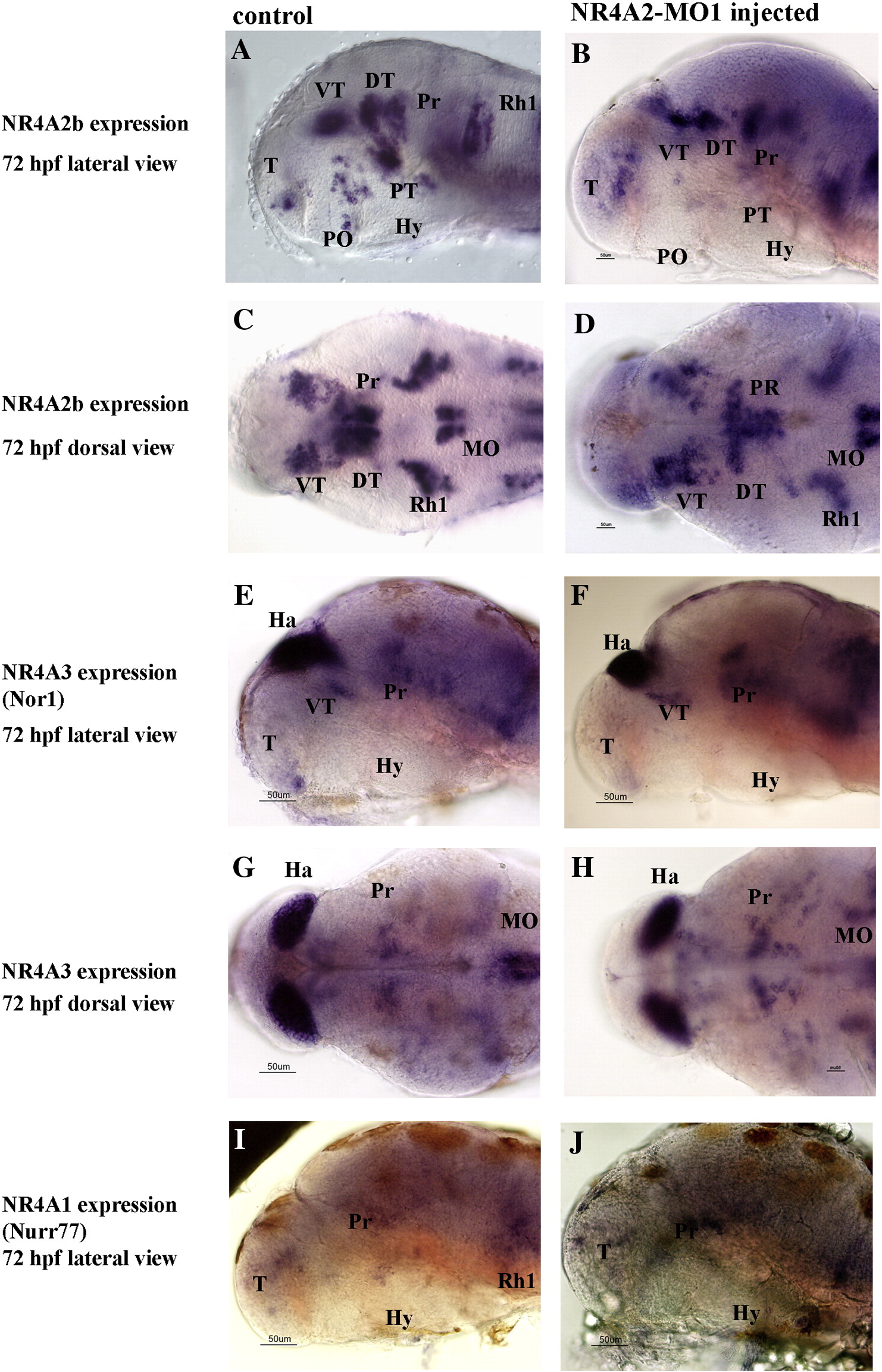 Fig. SD8 NR4A gene expression in morphant and control larvae. NR4A2b (A–D), NR4A3 (E–H) and NR4A1(I and J) expression was revealed by whole-mount in situ hybridization (blue staining) at 72 hpf in control and NR4A2-MO1-injected larvae. For all pictures anterior is to the left; A,B,E,F,I,J are lateral views, dorsal is to the top; C,D,G,H are dorsal views.
