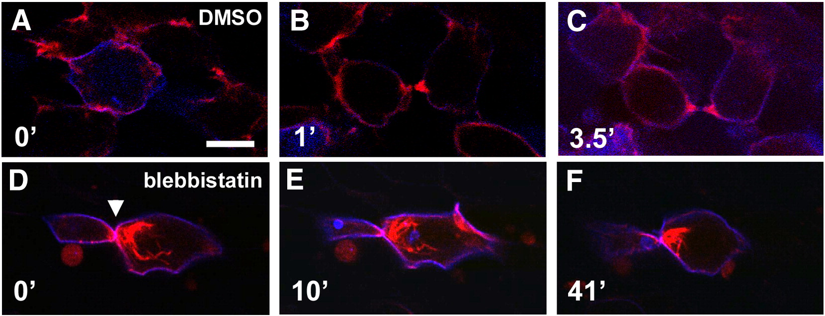 Fig. 7 Myosin II activity is required for cytokinesis. (A–F) Time-lapse sequences of cells expressing GPI-GFP (membrane, blue) and RFP-UtrCH (F-actin, red) in embryos treated with DMSO (A–C) or 50 μM blebbistatin (D–F). Arrowhead in D indicates site of cell fission. Time is in minutes. Scale bar = 10 μm.