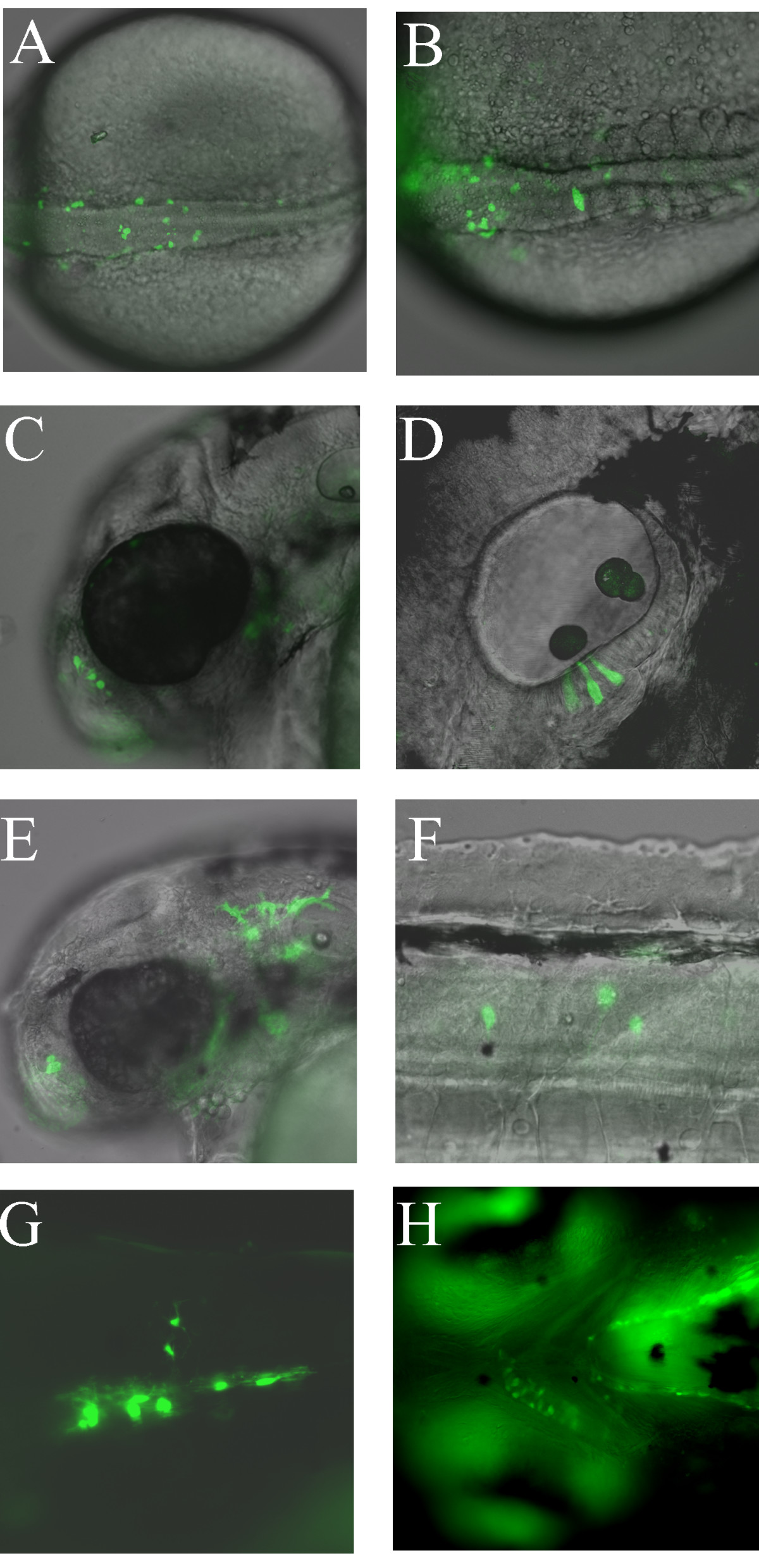 Fig. 2 Examples of mosaic GFP expression from transient transgenic sox10:GFP zebrafish injected with psox10-1252:GFP plasmid at the 1-cell stage. A, B. Dorsal views of two separate examples of pre-migratory neural crest GFP expression at the 20-somite stage. C. GFP expression in nasal cells at 48 hpf. D. GFP expression in otic epithelium at 48 hpf. E. GFP expression in xanthophores at 48 hpf. F. GFP expression in interneurons at 48 hpf. G. GFP expression in oligodendrocytes in trunk spinal cord at 96 hpf. H. Jaw cartilage expression at 96 hpf. All panels contain fluorescent images from live embryos (overlaid on DIC images in A-F). Orientation is with anterior to the left, dorsal uppermost except A, B (dorsal) and H (ventral).