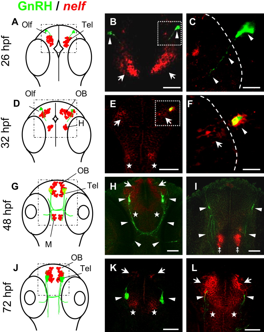 Fig. 4 Localization of nelf mRNA (in situ hybridization, red signals) in relation to GnRH3 cells and projections (immunocytochemistry for enhanced green fluorescent protein, green signals) in developing zebrafish. Diagrams show the orientation of the confocal micrographs (dorsal view of embryo head, anterior is top, H-I and K-L are different Z depths). Dashed line depicts the forebrain edge (C,F). A-C: At 26 hpf, GnRH3 cells (arrowheads) are in the olfactory epithelium, nelf mRNA is expressed in the telencephalon. C: Enlargement of boxed area in B. D-F: At 32 hpf, nelf expression in olfactory epithelium around and within GnRH3 neurons (arrowhead), in olfactory bulb (arrows) and presumptive hypothalamus (asterisks). G-I: At 48 hpf, GnRH3 axons project caudally along the path of the terminal nerve and intersect at the optic chiasm (arrowhead) and then proceed to innervate the retina. nelf is expressed within GnRH3 neurons in the terminal nerve (see also Fig. 5D-F). nelf is expressed in the olfactory bulb (arrows), telencephalon domain adjacent to the anterior commissure (asterisks), and in the midbrain (double crossed arrows). J-L: At 72 hpf, GnRH3 neurons in the terminal nerve no longer express nelf. nelf is expressed in olfactory bulb (arrow) and telencephalic domains (asterisks). Scale bar = 20 μM in C,F, 50 μM all other subfigures.