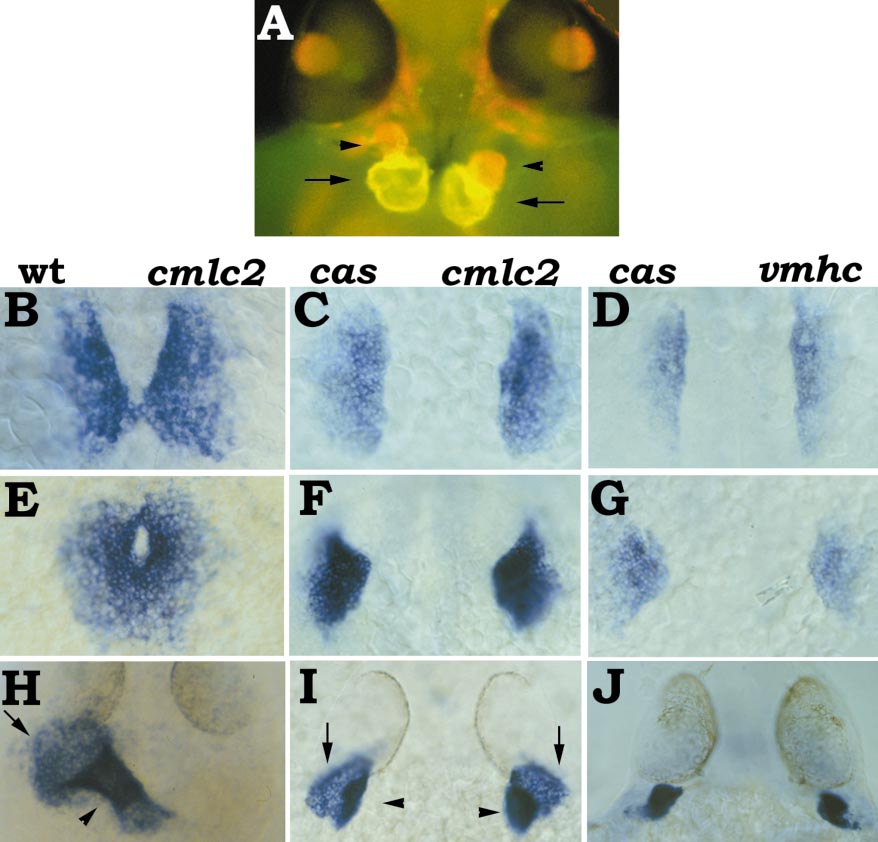 Fig. 5 Achievement of cardiac A–P pattern does not require cardiac fusion. (A) Ventral view of a 48-hpf Casanova (cas) mutant embryo stained with MF20 (TRITC) and S46 (FITC), anterior at the top. Red fluorescence indicates MF20 staining of ventricular tissue (arrowheads) in the anterior portion of each lateral heart, while yellow fluorescence indicates the overlap of S46 and MF20 staining in atrial tissue (arrrows) in the posterior portion of each lateral heart. Staining of eye musculature with MF20 is also apparent just medial to each eye. (B–J) Dorsal views, anterior at the top, of wild-type and cas mutant embryos. (B, E, H) Expression of cmlc2 in wild-type embryos. (C, F, I) Expression of cmlc2 in cas mutant embryos. (D, G, J) Expression of vmhc in cas mutant embryos. (B, C, D) 18-somite stage; while cardiac fusion begins in wild-type embryos (B), the myocardial precursors in mutant embryos (C) remain stationary. vmhc-expressing cells in mutant embryos are located medially (D). (E, F, G) 21-somite stage; while the cardiac cone forms in wild-type embryos (E), myocardial precursors in mutant embryos (F) bend slightly toward the midline, led by vmhc-expressing cells (G). (H, I, J) 24 hpf; as a tube forms in wild-type embryos (H), myocardial precursors in mutant embryos (I) appear to form modified cones, with vmhc-expressing cells leading the way (J). In both wild-type (H) and mutant (I) embryos, there is an apparent condensation of preventricular tissue (arrowheads) while preatrial tissue (arrows) remains more diffuse.