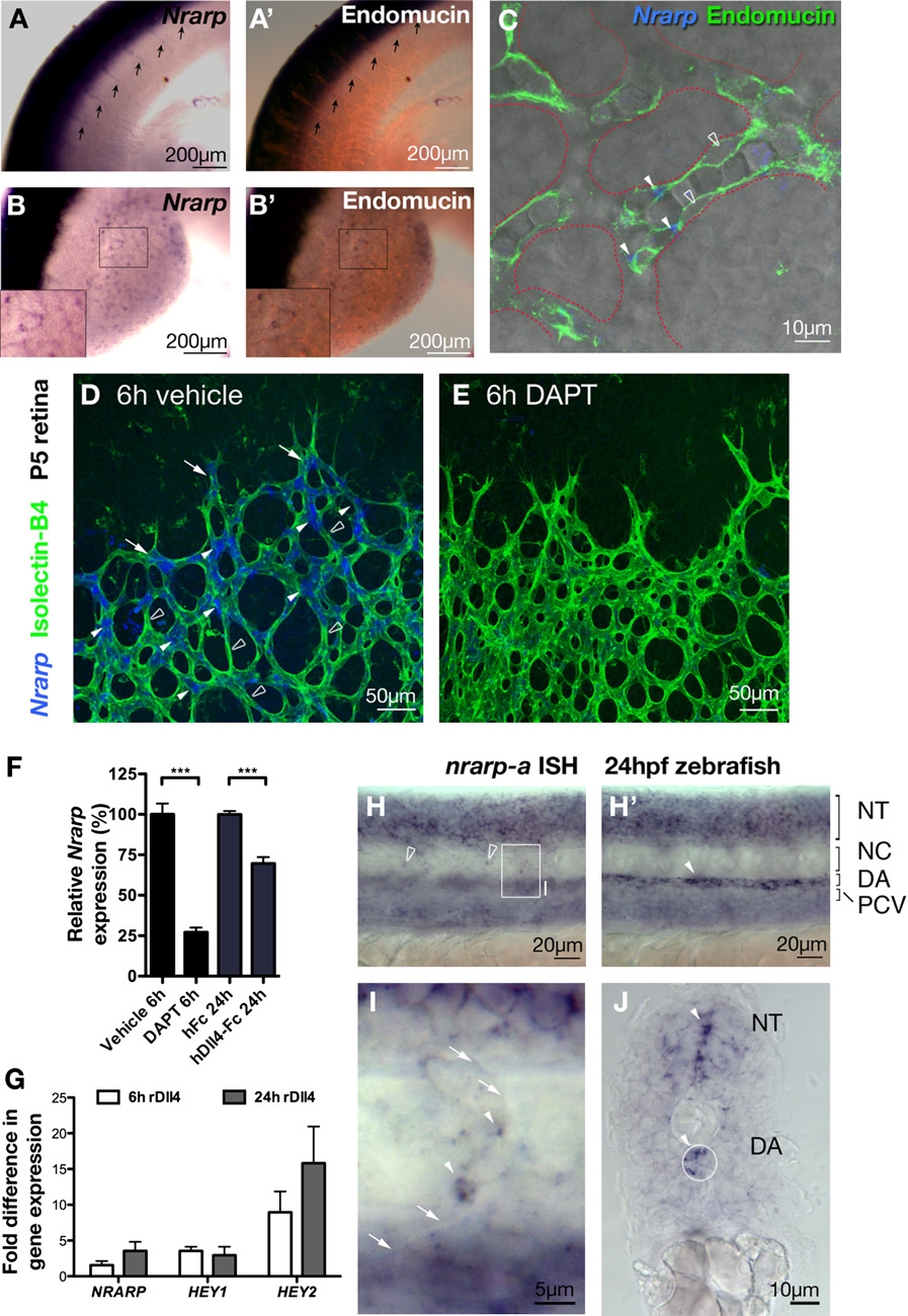 (H–J) nrarp-a ISH in 24 hpf zebrafish embryos. (H) and (H′) are lateral views of the same region in the zebrafish trunk taken at different focal planes. The boxed region in (H) is magnified in (I). (J) is a transverse section of the zebrafish trunk. nrarp-a is expressed in ECs of ISV (arrowhead, [I]) and in cells located between somite boundaries (empty arrowheads, [H]). nrarp-a is also expressed in the DA and in the neural tube (H′, J). Arrows in (I) indicate somite boundary. NT, neural tube; NC, notochord; DA, dorsal aorta; PCV, posterior cardinal vein.