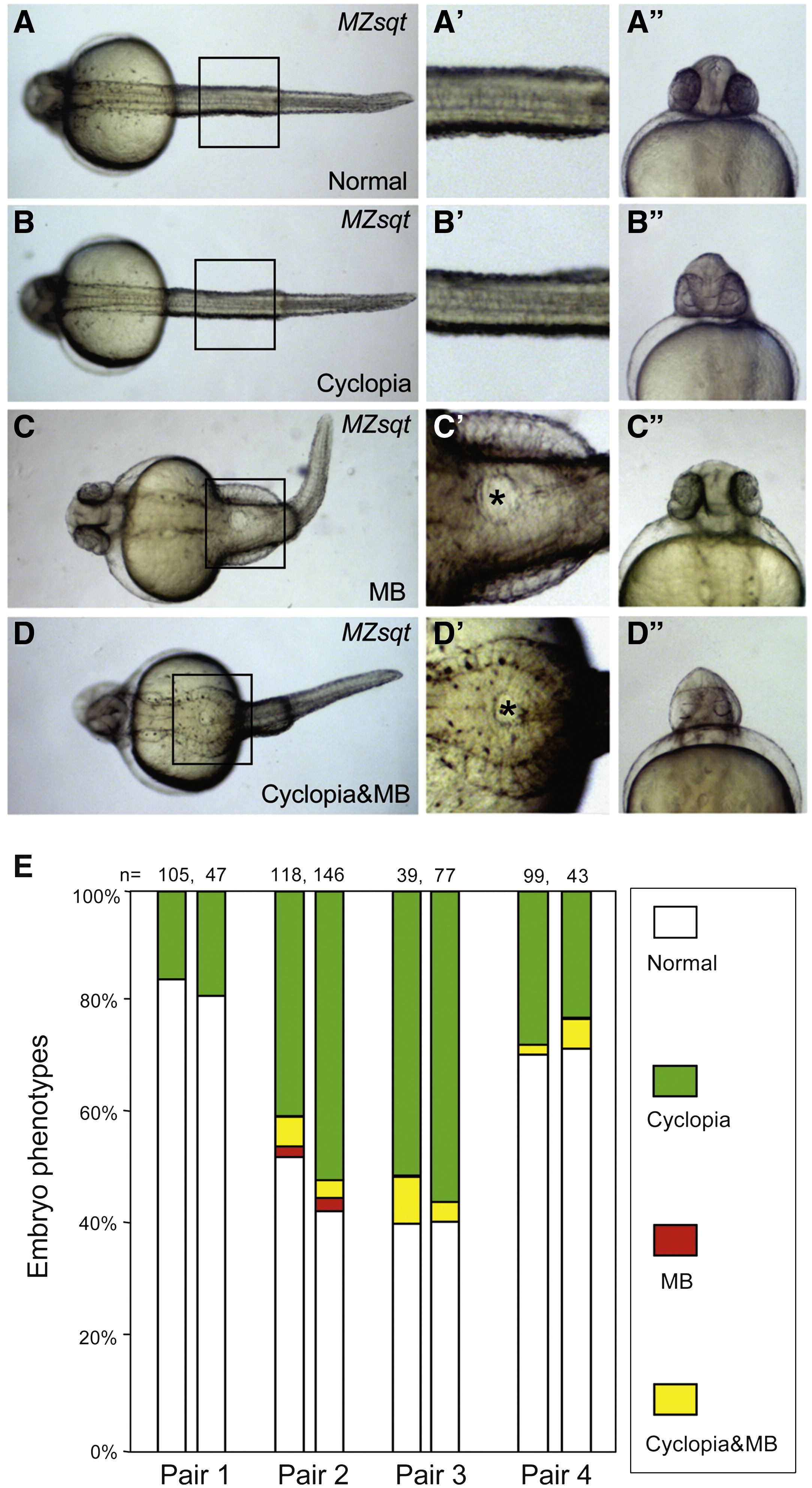 Fig. 1 Spontaneous midline bifurcations among MZsqt embryos. (A–D) Various morphological phenotypes observed in MZsqt embryos. Four classes of embryos were observed in MZsqt embryos on 1 day post fertilization: normal-appearing embryos (A–A″), cyclopean embryos (B–B″), MB embryos (C–C″) and embryos with cyclopia and MB embryos (D–D″). The images in the central column (′) are magnifications of the boxes in the left column. The asterisks (*) label the bifurcated areas. The right hand column images (″) are frontal views of the same specimen. (E) Parental genetic background influences the incidence of MB manifestations. Repeat crosses were performed with four pairs of MZsqt parents. Embryo numbers are shown and the percentages of each embryonic phenotype indicated: normal appearing (white); cyclopia alone (green); MB alone (red) and MB + cyclopia (yellow). Pair 1, representative of the typical phenotypic spectrum, produced embryos with cyclopia but no MB. However, pairs 2 to 4 reproducibly yielded the MB phenotype.