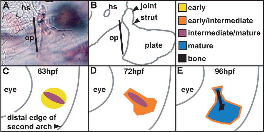 Fig. 5 Model for osteoblast differentiation during formation of the opercle. A: Alizarin Red staining of the fan-shaped opercle (op) at 144 hours postfertilization (hpf) showing its connection to the hyosymplectic (hs) cartilage proximally. B: Camera lucida drawing of A showing the joint, strut, and plate of the opercle. C-E: See text for explanation.