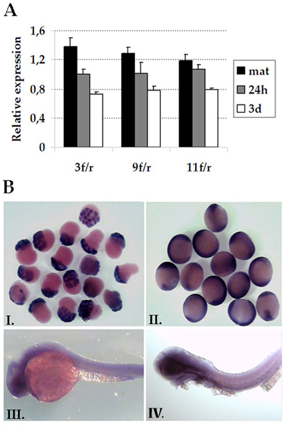 A. Expression of prdm5 was measured by qPCR using three pairs of primers (3f/r, 9f/r and 11f/r) that amplify different regions of the transcript. Relative expression levels at each developmental stage (2–8 cell stage = mat, 24 hours pf = 24h, 3days pf = 3d) were calculated with respect to the average expression levels in all samples. B. Whole mount in situ hybridization of 1 hpf (I), 9 hpf (II), 24 hpf (III) and 48 hpf (IV) zebrafish embryos stained with a cRNA dig-labeled prdm5 probe. Ubiquitously high expression levels are detected in the first two stages; lower levels are present in 24 and 48 hpf.