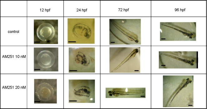 Fig. 4 Morphological aspect of zebrafish embryos and larvae at 12, 24, 72 and 96 hpf. The developmental stages showed in the pictures were the same in the control group and in the two groups exposed to AM251 (10 and 20 nM) in all the stages analyzed. Scale bars: 500 mm.
