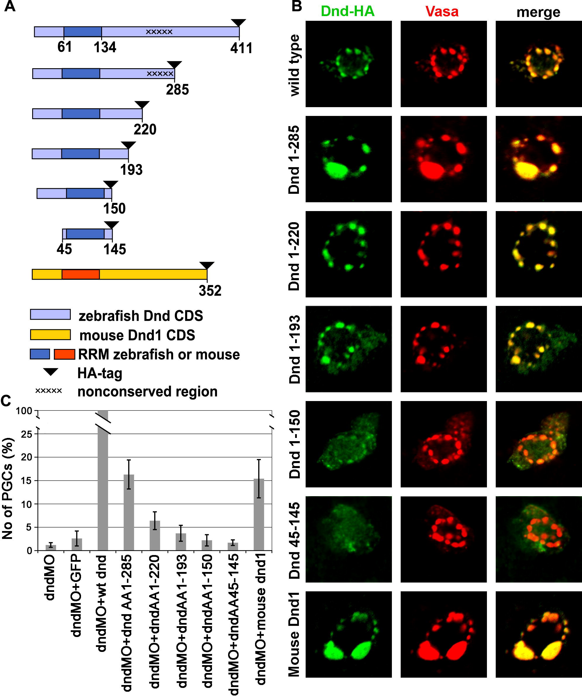 Fig. 2 Deletions of parts of Dead end protein reveal domains important for protein localization and function. (A) Schematic drawing of Dead end deletion constructs. (B) Intracellular localization of the various Dnd-deletion fusion proteins detected by immunohistochemistry with anti-HA antibody (Green) in comparison with the position of the GCGs reported by anti-vasa antibody staining (Red). (C) A chart depicting the ability of the various deletions constructs to supplement for wild type Dead end. The values represent the number of rescued PGCs in embryos co-injected with a specific Dnd truncated protein and dnd MO, normalized to the PGCs rescued by a wild type dnd mRNA injection (see the text for details).