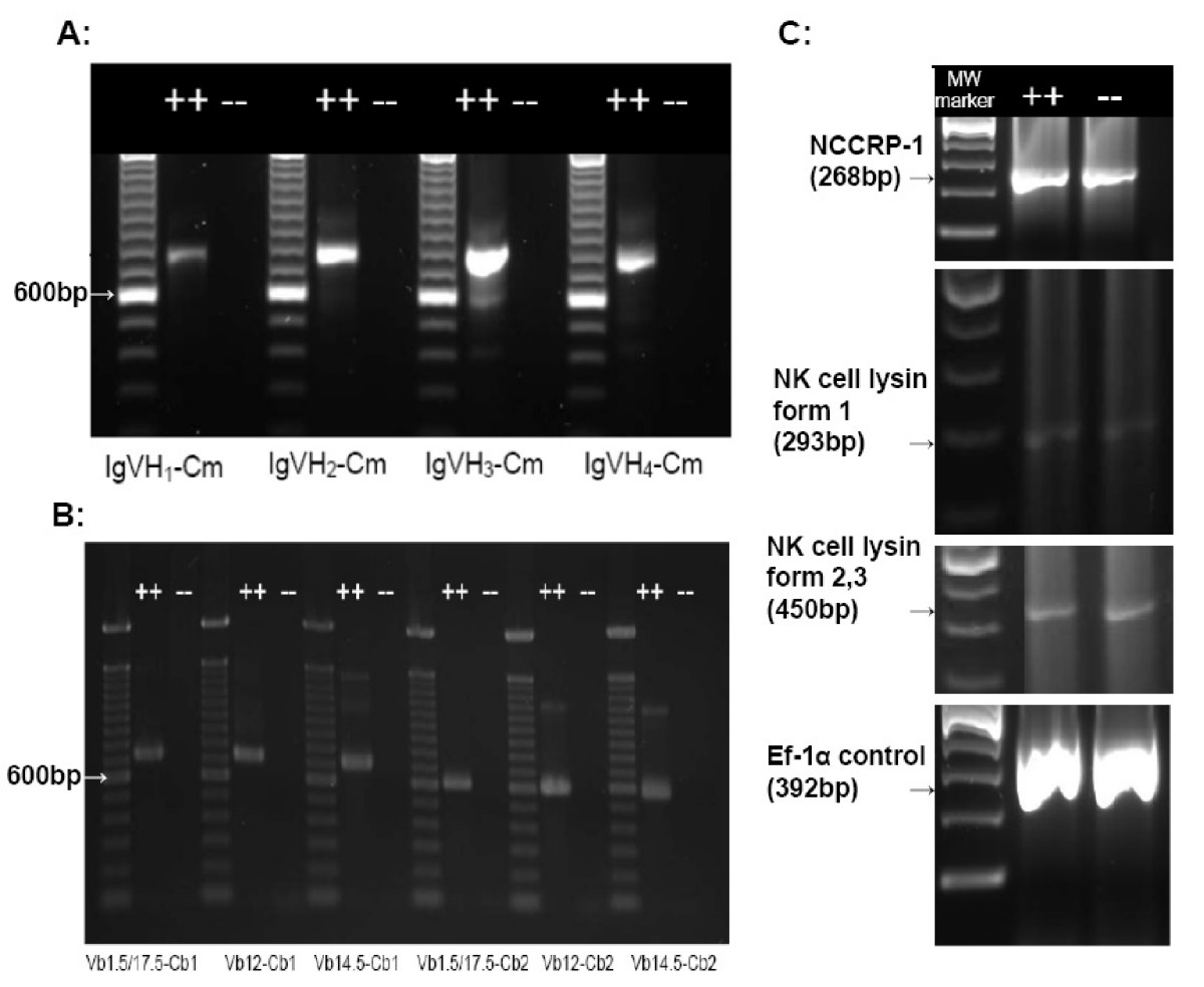 Fig. 2 RT-PCR analyses of mutant and wild-type zebrafish kidney hematopoietic tissue. Evaluation of expression of Immunoglobulin (Ig) heavy chain gene rearrangements, T-cell receptor (TCR) β chain rearrangements, NK-Lysin, NCC Receptor Protein-1 (NCCRP-1), and transcription elongation factor 1-α (EF1-α, as a positive control) in mutant and wild-type zebrafish by RT-PCR. (A) Nested RT-PCR using primers spanning VDJ-Cm in Ig VH1-VH4 [16]. (B) Nested RT-PCR using primers spanning TCR V(D)J-Cβ [16]. (C) RT-PCR was used to analyze mRNA expression using primers specific for NCCRP-1, NK lysin form 1, NK lysin forms 2 and 3 and EF1-α (primers are listed in Table 1). All RT-PCR assays included no-RT controls and no product was obtained (data not shown).