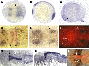 Fig. 2 Expression pattern of zebrafish wnt3a. (A,B) 3-somite stage. (C) 14-somite stage, lateral view. (D–F) 3-somite stage (G–I) 24–27 hpf. All panels, anterior is to the left. (A) Dorsal view. (B) Lateral view of the same embryo as in A. wnt3a transcripts are observed in the prospective midbrain, the hindbrain (arrow) and the tailbud (visible in panel B). (C) Expression now extends ventrally in the diencephalon (arrowhead) and to a lesser extent at the MHB (asterisk). Expression in the dorsal neural tube (arrow) has strengthened and extends from the rostral hindbrain to the tailbud. Tailbud expression has resolved into a stronger dorsal domain and weaker ventral domain. (D) Double in situ for wnt3a (blue) and krox20 (red). Dorsal views focused the midbrain–hindbrain region. Asterisks indicate r3 and r5 krox20, arrow points out overlap of r5 krox20 with anterior limit of hindbrain wnt3a. (E,F) Double in situ for wnt3a (blue) and pax2a (red fluorescence in panel (F)). Same view as in (D). Dotted line indicates same wnt3a midbrain expression domain in both panels. Asterisk indicates where wnt3a overlaps with the lateral portion of pax2a. Arrow indicates anterior limit of hindbrain domain. (G) Dorsal view centered on the midbrain. Arrow indicates anterior wnt3a limit in G–I, which resides in the diencephalon. Arrowhead indicates posterior limit of midbrain expression. Asterisk indicates rhombic lip/cerebellar expression. (H) Lateral view of embryo in (G). Note ventral extension in the diencephalon (arrow), but expression is restricted dorsally at the MHB (arrowhead). (I) Double in situ for wnt3a (red fluorescence) and pax6 (blue). Dorsal view focused on midbrain. Forked arrow indicates two diencephalic expression domains of pax6. wnt3a expression terminates between those two domains.