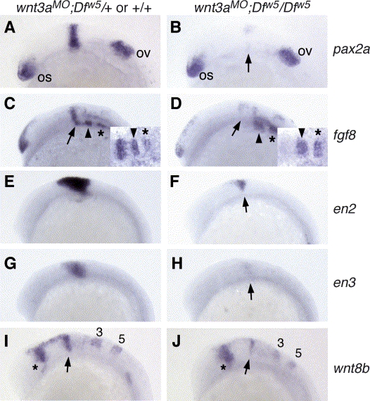 Fig. 4 Marker expression in 12-somite stage wnt3aMO;Dfw5/Dfw5 embryos. All panels are lateral views, anterior to the left. The in situ probe used is indicated to the right of each row, and the embryonic genotype is indicated above each column. (A,B) Note the strong reduction in pax2a in wnt3aMO;Dfw5/Dfw5 embryos in the MHB (arrow), while the optic stalk (os) and otic vesicle (ov) expression are unaffected. (C,D) fgf8 is expressed in the MHB (arrows), r2 (arrowheads) and r4 (asterisks). Note specific reduction of MHB fgf8 expression in wnt3aMO;Dfw5/Dfw5 embryos. Insets: dorsal views focused on MHB region, anterior left. (E,F) en2 expression is strongly reduced or absent in wnt3aMO;Dfw5/Dfw5 embryos (arrow) as is en3 (arrow in H). Of note: en3 is not affected in Dfw5/Dfw5 embryos at this stage (Lekven et al., 2003). (I,J) wnt8b is variably reduced in the MHB of wnt3aMO;Dfw5/Dfw5 embryos (arrow), while the forebrain (asterisk), r3 and r5 domains (numbered) are not significantly different from wild type.
