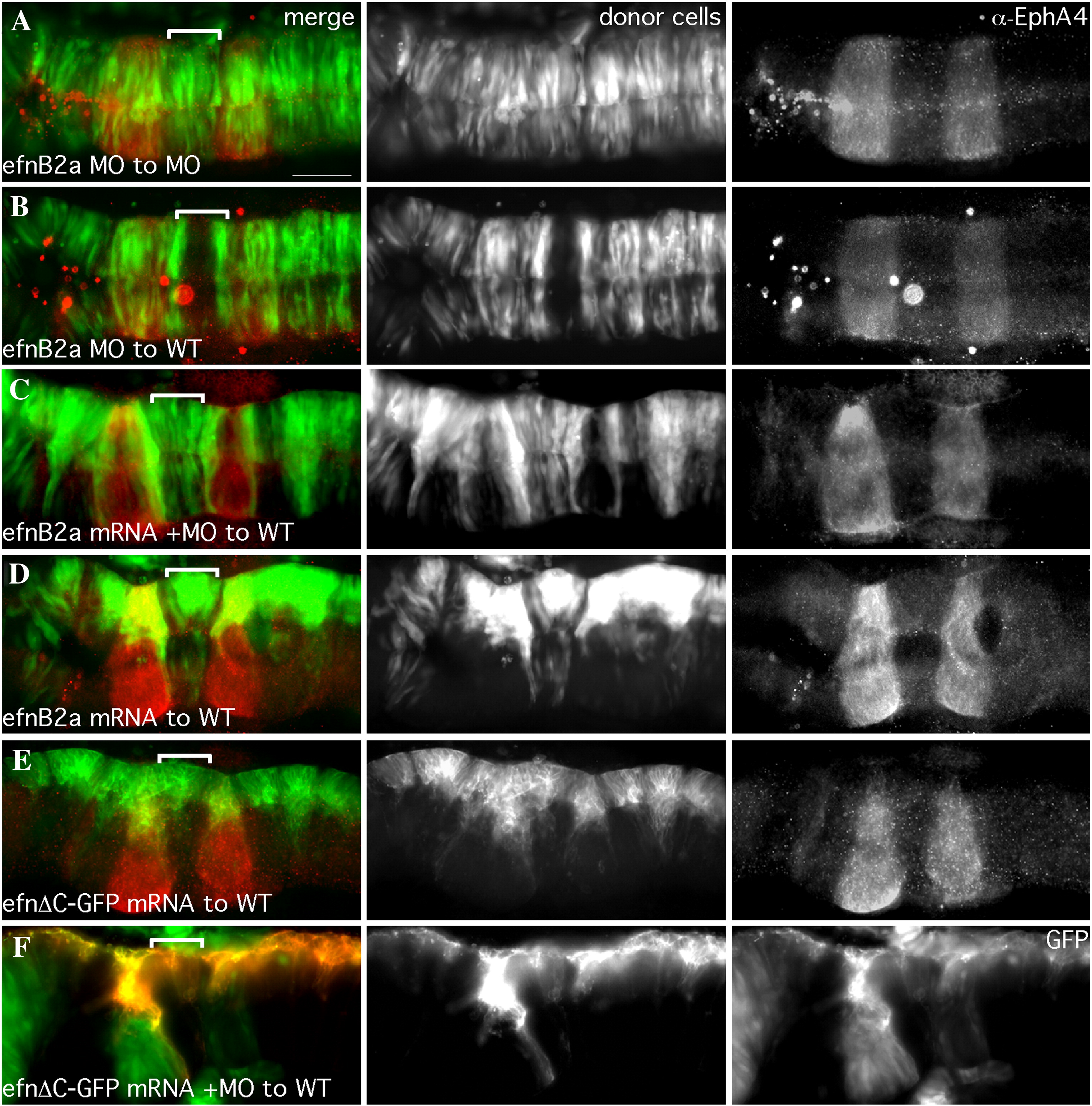 Fig. S1 efnB2a mRNA expression rescues cell–cell adhesion in EfnB2a MO r4, while over-expression induces adhesion-based clustering. Dorsal views of 18 hpf embryos with anterior to the left. r4 is indicated by a white bracket. Left hand panels are merged images of individual channels. Middle panel: Donor cells, pseudocolored in green (A–E) or red (F) in the merge, express GFP (A–E) or memb-RFP (F) from injected mRNA. r3 and r5 are visualized by α-EphA4 staining (red), or by the expression of GFP in r3 and r5 of a transgenic pGFP5.3 host. (A) Cells depleted of Efnb2a by MO injection contribute normally to an EfnB2a MO host embryo. (B) Cells depleted for EfnB2a by MO are excluded from r4 of a WT host. (C) EfnB2a MO donor cells coinjected with EfnB2a mRNA contribute to r4 of WT hosts. Ectopically expressing EfnB2a+ donor cells are simultaneously excluded from rhombomeres that do not normally express EfnB2a and instead express Eph receptors (r2,3,5, and r6). (D) WT donor cells injected with a “rescuing” amount of EfnB2a mRNA form unilateral cell clusters in r4 of a WT host. (E) WT donor cells expressing the EfnB2aΔC-GFP allele, in which the C-terminus is replaced with GFP, fail to cross the midline in r4 of a WT host. Note that this GFP fusion protein is localized to cell membranes, as expected. (F) Efnb2a MO donor cells expressing the EfnB2aΔC-GFP allele also fail to cross the midline in r4 of a WT host. Note that donor cells are visible in the GFP channel, confirming expression of the truncated allele. Scale bar: 50 μm.