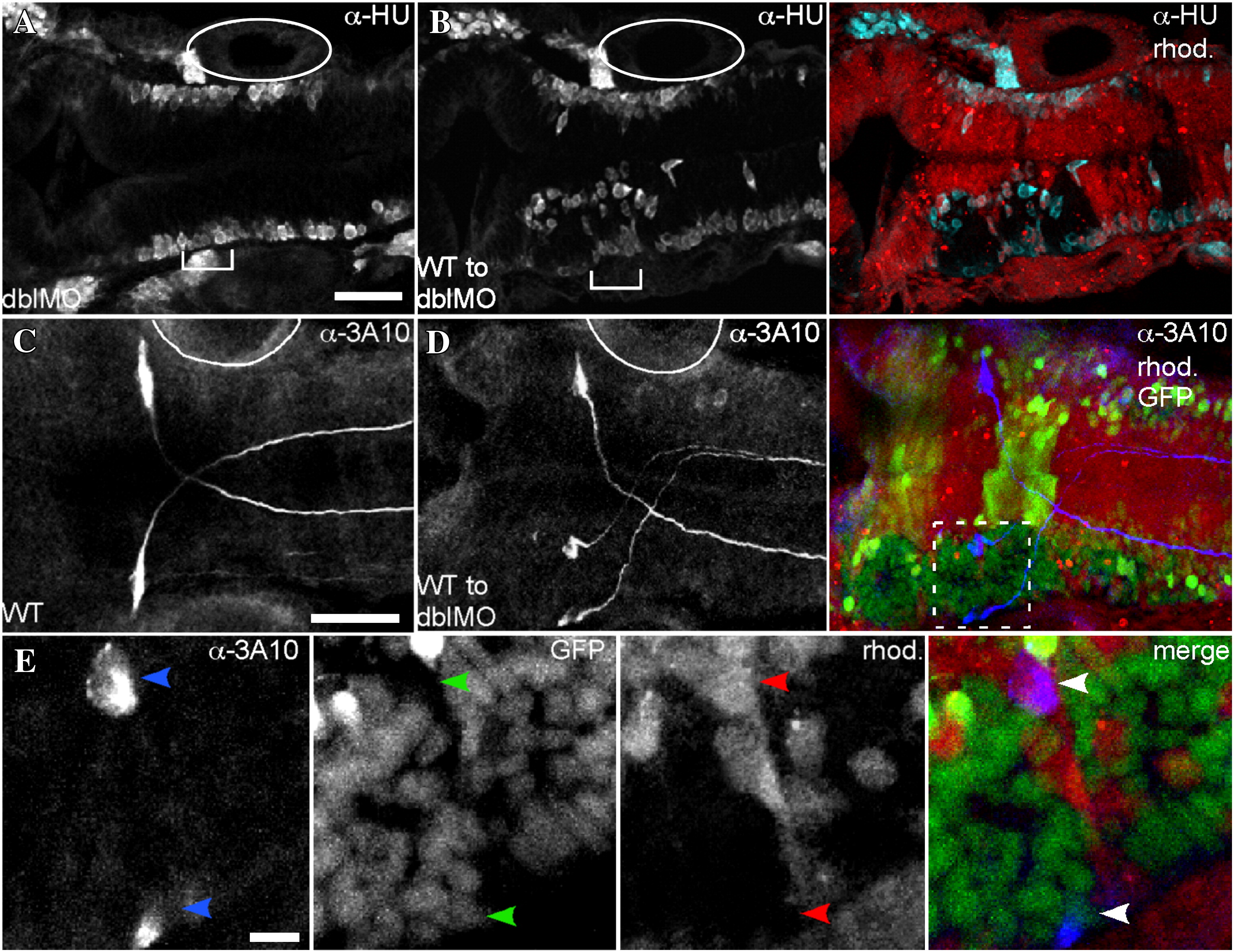 Fig. S8 WT cell clusters are neurogenic. Immunostaining of embryos shown in dorsal view with anterior to the left using α-HU at 26 hpf (A,B), or α-3A10 at 30 hpf (C–E). (A) In an EphA4;EfnB2a double MO embryo, neurogenesis, indicated by α-HU immunostaining, takes place at the lateral surfaces of the neuroepithelium. (B) Left panel shows α-HU immunostaining. Right panel is a merge showing rhodamine-injected double MO host cells surrounding unlabeled WT cell clusters. Ectopic neurogenesis is apparent at the edges of WT cell clusters (cyan). (C) α-3A10 shows the bilateral Mauthner neuron pair in r4 of a 30 hpf WT embryo. (D) Left panel shows α-3A10 immunostaining. Right panel is a merge of 3A10 staining in blue with rhodamine-injected double MO host cells (red) that also contain the noiGFP transgene (yellow) surrounding clusters of histone-GFP+ nuclei from WT donor cells (green). In WT to double MO mosaic embryos, ∼ 15% of embryos show duplication of the Mauthner neuron (N = 3/19). (E) Closeup view of the boxed region in D shows that one of the ectopic Mauthner neurons in r4 is donor-derived (histone-GFP+ nucleus, rhod.-negative cytoplasm). Scale bars: 50 μm (A–D), or 10 μm (E). Otic vesicle, adjacent to r5, is indicated by full or partial oval.