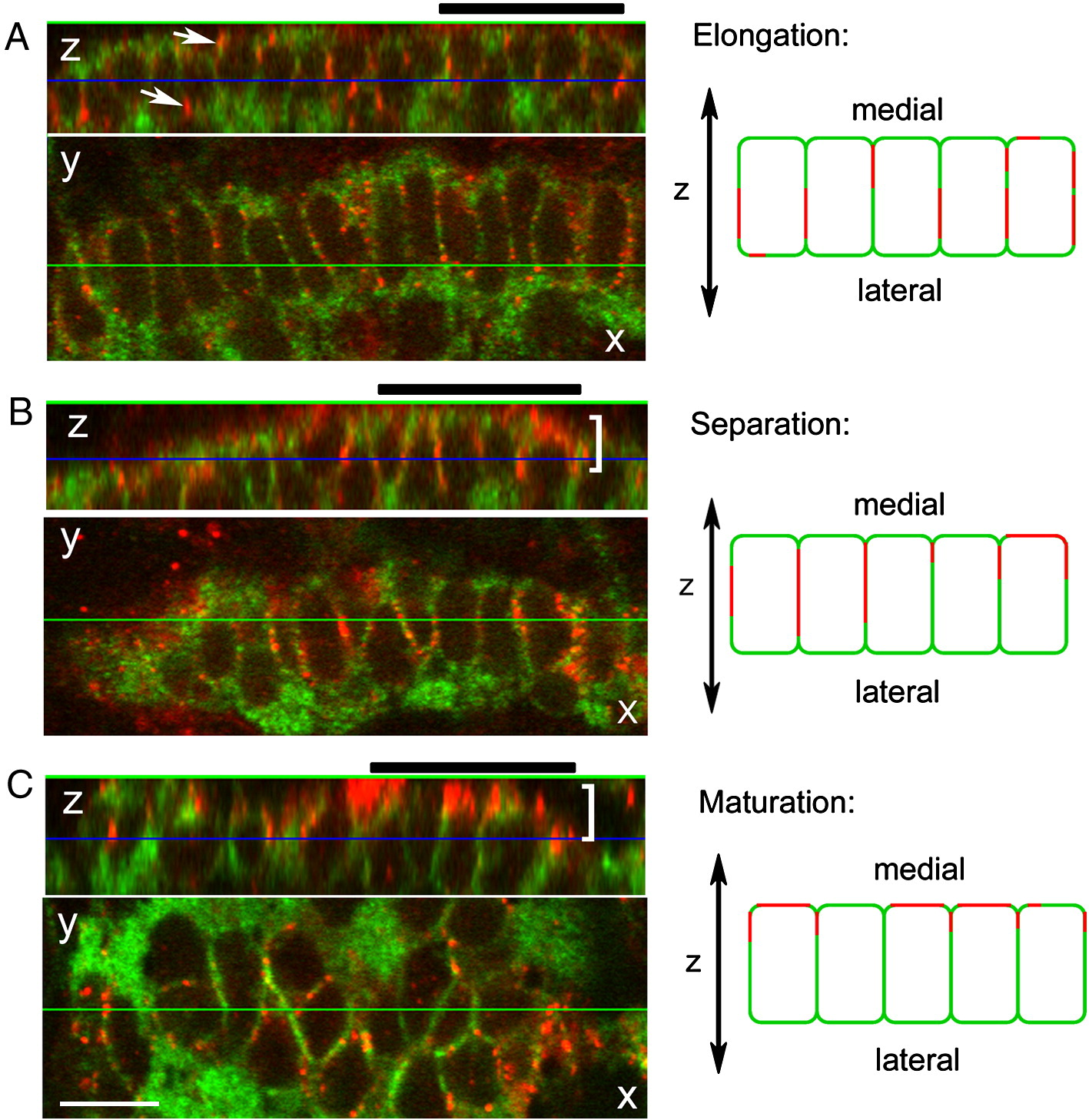 Fig. 3 Cx43 localization during joint morphogenesis. A single image from a Z-stack collected by confocal microscopy is shown in the X–Y plane. The display on top represents a slice through the Z-stack along the horizontal green line (i.e., the X–Z plane). The blue line in this display indicates the location of the front image within the Z-stack. During elongation (A), Cx43 (arrows) is found surrounding the ZNS5 positive cells. During separation (B) and maturation (C), Cx43 appears polarized (brackets) toward the medial face of the ZNS5-positive cells. A group of five cells from the X–Z planes are represented by cartoons to the right of each image. Thick black bars over each X–Z plane identify the cells represented by cartoons at the right. Scale bar, 10 μm.