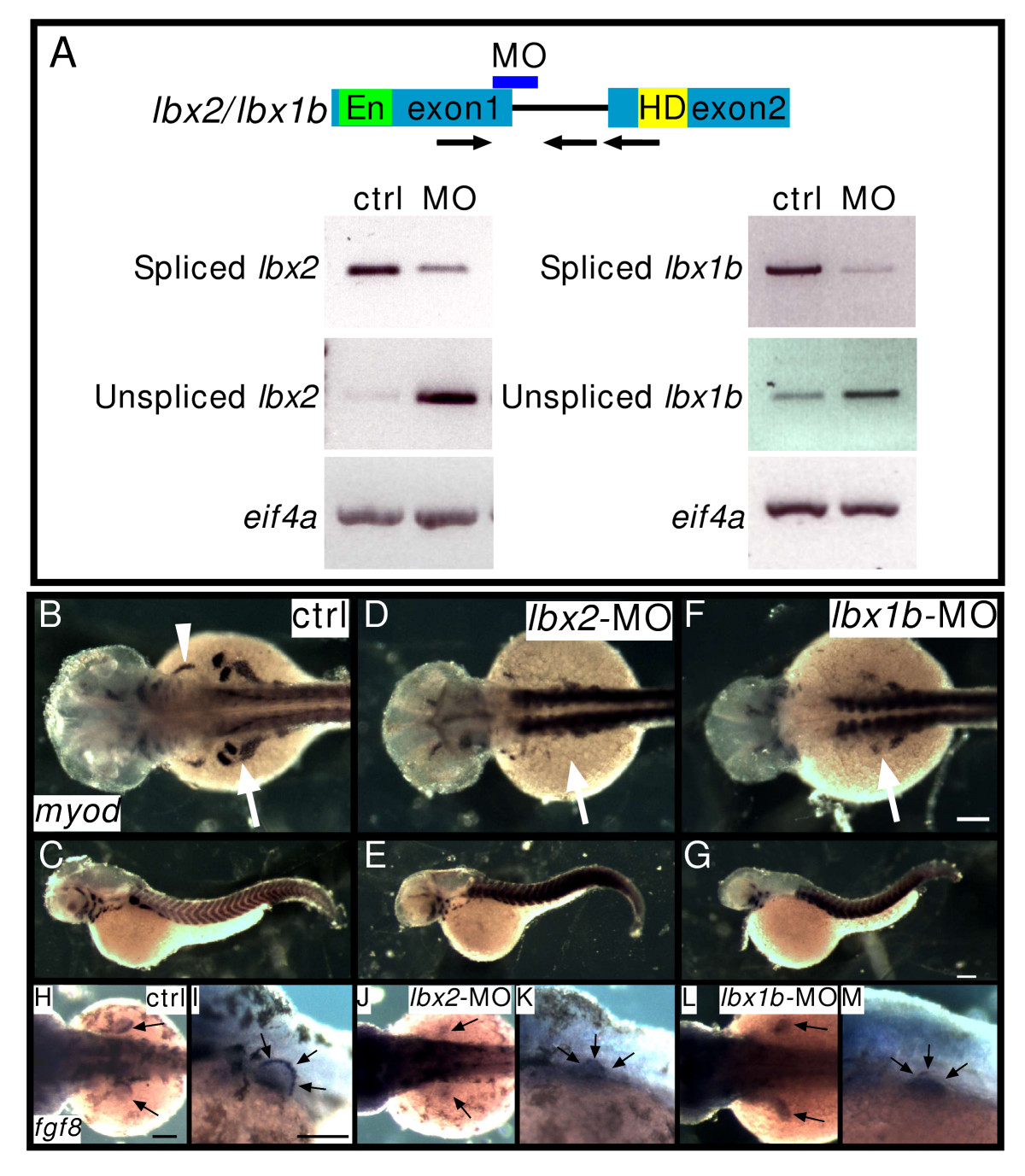 Fig. 2 Lbx2 and Lbx1b function in hypaxial muscle development. A: Splice donor MOs against lbx2 or lbx1b inhibit correct splicing of lbx2 or lbx1b, respectively. RT-PCR was performed using bud stage (lbx2) or segmentation stage (lbx1b) embryos. Spliced bands and unspliced bands in the lbx-splice donor-MO lane indicate aberrantly spliced message increases and correctly spliced message decreases. Arrows indicate primers. En: Engrailed domain, HD: homeodomain. Arrows indicate specific primers for amplification of correctly spliced or unspliced lbx genes. B-G: Expression of myod in control (ctrl) embryos (B, C), lbx2-MO injected embryos (D, E). lbx1b-MO injected embryos (F, G). The white arrowhead indicates the sternohyoideus primordium (B) and the white arrows indicate fin muscle precursors. myod expression in fin bud is suppressed by lbx2-MO or lbx1b-MO (B: 100%, n = 36; D: 12%, n = 56; F: 16%, n = 24). H-M: Expression of fgf8 in ectodermal cells of the fin bud. Control embryos (H, I, 100%, n = 12), lbx2-MO injected embryos (J-K, 100%, n = 12), lbx1b-MO injected embryos (L-M, 100%, n = 15). (B, D, F, H, J, L) Dorsal views, rostral towards the left, (C, E, G. I, K, M) lateral views, rostral toward the left, dorsal toward the top. Scale bar: (B-M) 100 μm.