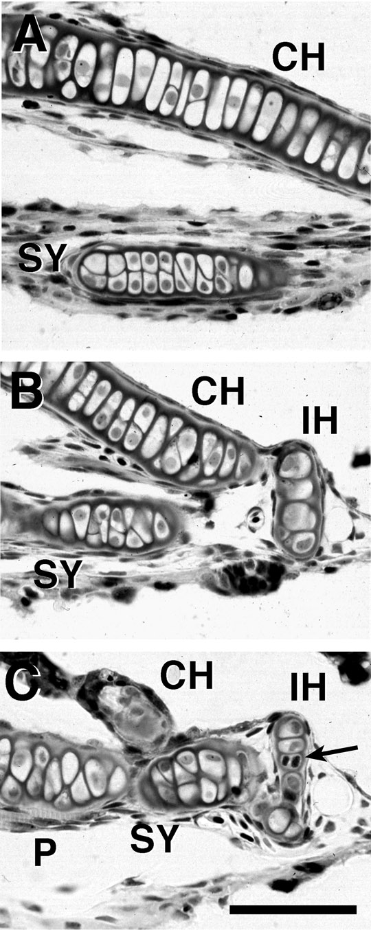 Fig. 7 Chondrocyte arrangements in advanced larval cartilages. Horizontal 5-μm Epon sections through the pharynx at day 8, stained with methylene blue and basic fuchsin. The sections were selected from a serial series running ventral (A) to dorsal (C). Anterior is to left and medial is to the top. Chondrocyte cytoplasm is pale, such that the dark cell appositions and nuclei are prominent. Note the thin perichondrial layer around each of the cartilages and the chondrocyte in late telophase (arrow in C). Scale bar: 50 μm.