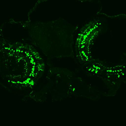 Expression: Trigeminal and Vagal cranial ganglia with cuadal projections down the tail and projections anteriorly,few scattered cell bodies in MB, spinal cord neurons, many distinct cell bodies throughout the hindbrain, few cell bodies in olfactory region, eye - cell bodies in ONL (bipolar), RGCs? and few PRCs, plexiform layers not expressing, eye expression varies slightly