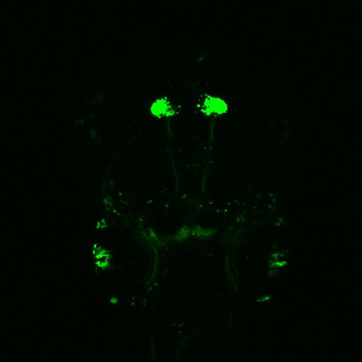 Expression: most of the habenular neurons with projection back t o IPN (lightly labeled), possible branching of projections, ear