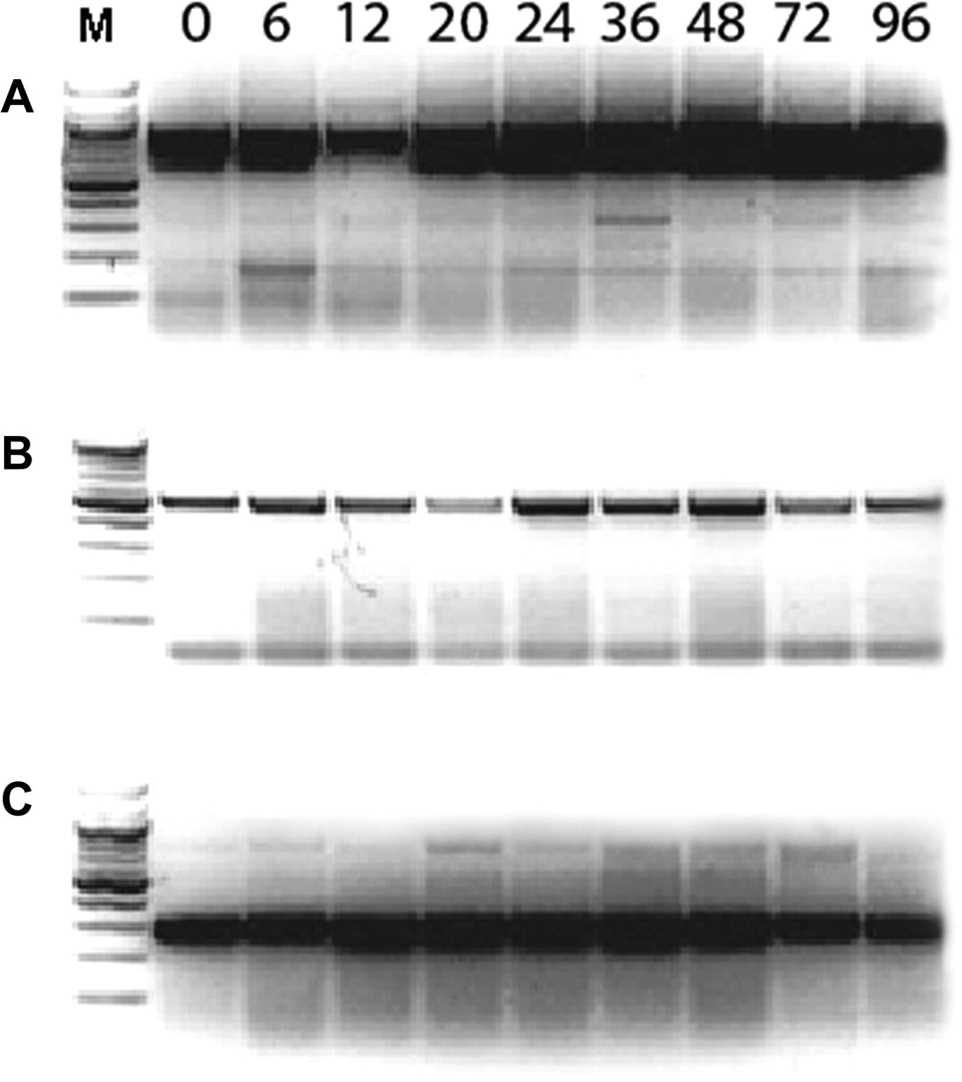 Fig. 3 Temporal expression pattern of zebrafish SCG10a and SCG10b genes. RT-PCR was undertaken using RNA isolated from wild-type embryos at 0, 6, 12, 20, 24, 36, 48, 72, and 96 hpf; A, SCG10a; B, SCG10b; C, β-tubulin; M, 100 bp DNA ladder (New England Biolabs).