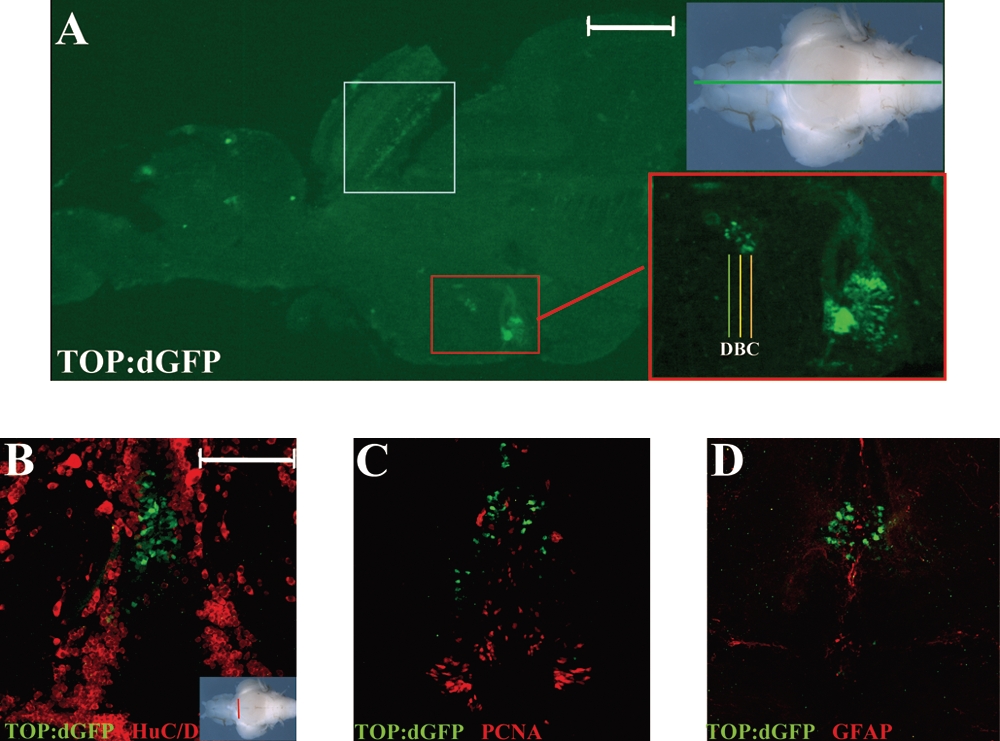 Fig. 5 Immunohistochemical identification of Wnt-responsive and Lef1-expressing cells in the adult hypothalamus. (A) GFP antibody staining on a sagittal section through the midline of a TOP:dGFP adult brain. Specific expression of GFP is observed in the optic tectum (white box) and the periventricular hypothalamus (red box). (B–D) Twenty-five-micron hypothalamic cross sections immunostained for the markers listed in each panel. GFP-positive cells do not express HuC/D, PCNA, or GFAP. Scale bars: (A) 300 μm; (B) 100 μm.
