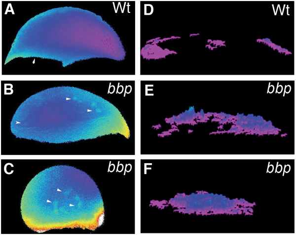 Fig. 4 Selected frames of ratiometric images of WT (A) and bbp at early epiboly (B) and bbp at 40% epiboly (C). Algorithm of the calcium release representing the frequency and location of fluxes for the duration of the time course of early WT embryo in A (D), early bbp embryo in B (E), and 40% epiboly bbp embryo in C (F). Composites represent data collected over 1 hour of imaging of an individual embryo.