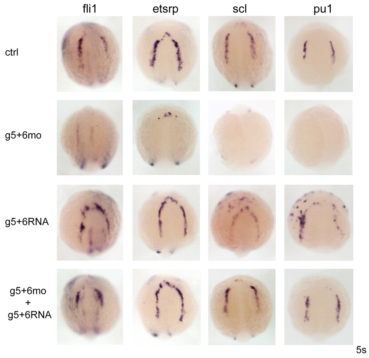 Fig. 2 gata5 and gata6 rescue and gain-of-function experiments confirm necessity and identify sufficiency for myelopoiesis. Injection of exogenous gata5 and gata6 mRNA (g5+6RNA) into wild-type embryos did not induce fli1 or etsrp, whereas scl and pu1 were ectopically expressed. Rescue of all four genes was seen in gata5 and gata6 morphants co-injected with gata5 and gata6 mRNA (g5+6mo + g5+6RNA) when compared with gata5 and gata6 morphants alone (g5+6mo). Views are anterior-dorsal.