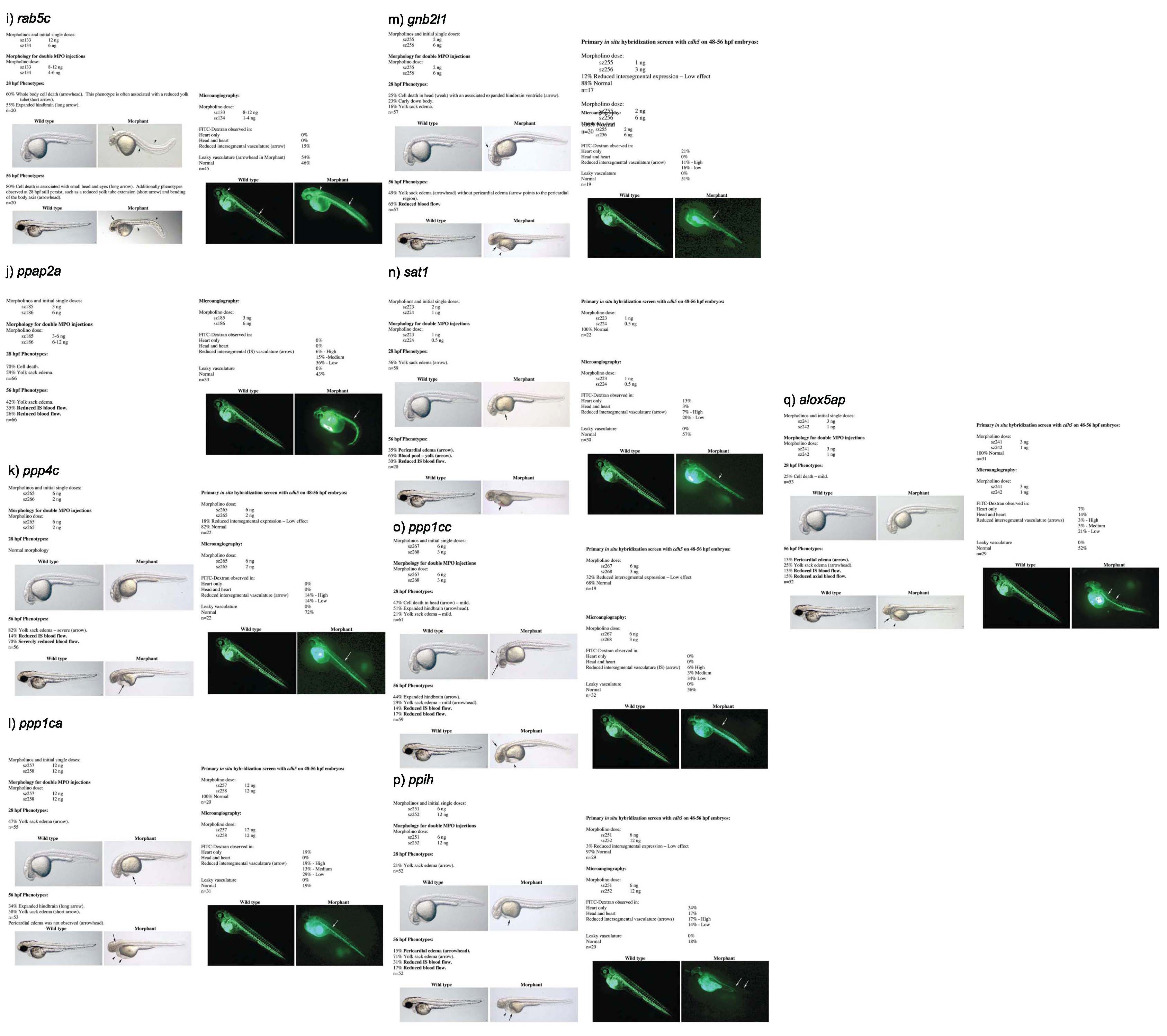Fig. S4b Summary of Zebrafish Knock-Down Phenotypes The results from the MPO knock-down of (a) fzd6, (b) X99384, (c) ctsz, (d) rab11, (e) hexb, (f) p2ry5, (g) ralb, orthologue 1, (h) ralb, orthologue 2, (i) rab5c, (j) ppap2a, (k) ppp4c, (l) ppp1ca, (m) gnb2l1, (n) sat1, (o) ppp1cc, (p) ppih and (q) alox5ap, are listed with regards to: