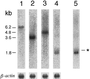 Fig. 3 Northern blot analyses of F-spondin1, F-spondin2, mindin1, and mindin2. Four micrograms of poly(A)+ RNA isolated from 28-h embryos was run in each lane. Lane 1, F-spondin1; lane 2, F-spondin2; lane 3, mindin1; and lanes 4 and 5, mindin2. Exposure time was the same in lanes 1-4. Lane 5 represents a sixfold-longer exposure of lane 4. Asterist indicates minor transcripts of mindin2, approximately 2.0-2.3kb in size. β-actin indicates patterns of rehybridization with a β-actin probe.