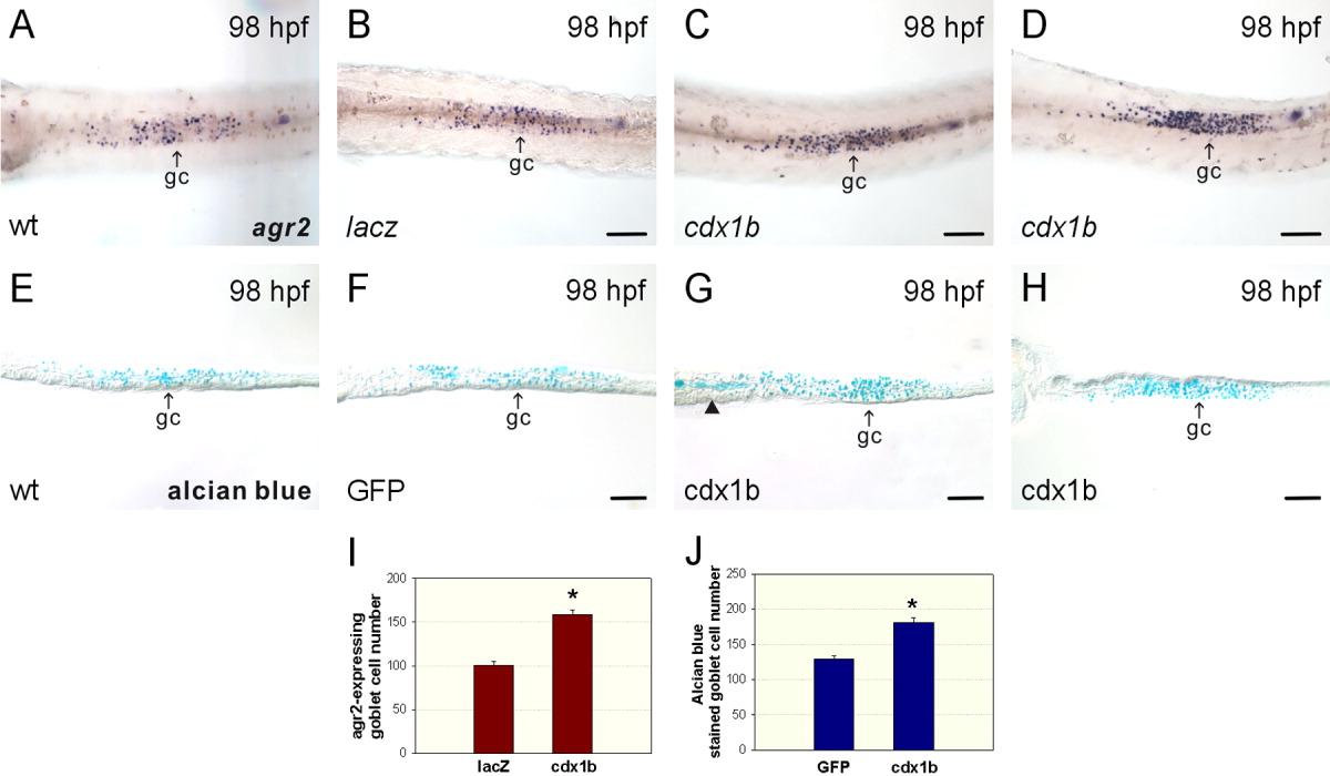Fig. 7 Overexpression of cdx1b increased goblet cell numbers in the intestine. A-D: Wild type (A), lacZ mRNA-injected (B), and cdx1b mRNA-injected (C, D) 98-hr post-fertilization (hpf) deyolked embryos hybridized with agr2 antisense RNA probes. E-H: Wild type (E), CMV-GFP-injected (F), and CMV-cdx1b-injected (G, H) 98-hpf deyolked embryos stained with alcian blue. The arrowhead in G indicates secreted mucin in the lumen. I: Comparison of agr2-expressing goblet cell numbers in the intestine of lacZ (n = 20) and cdx1b (n = 20) ectopically expressed embryos. J: Comparison of alcian blue-stained goblet cell numbers in the intestine of GFP (n = 20) and cdx1b (n = 20) ectopically expressed embryos. Error bars indicate standard errors. *P < 0.001. Gc, goblet cell. Scale bars =100 μm.