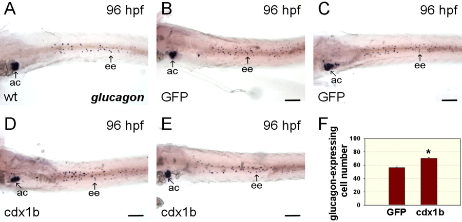 Fig. 8 Effects of ectopic cdx1b expression on the development of enteroendocrine cells in the intestine. A-E: Wild type (A), CMV-GFP-injected (B, C), and CMV-cdx1b-injected (D, E) 96-hr post-fertilization (hpf) deyolked embryos hybridized with glucagon antisense RNA probes. F: Comparison of glucagon-expressing enteroendocrine cell numbers between CMV-GFP-injected (n = 29) and CMV-cdx1b-injected (n = 27) embryos. Error bars indicate standard errors. *P < 0.001. Ac, pancreatic α cells; ee, enteroendocrine cells. Scale bars = 100 μm.