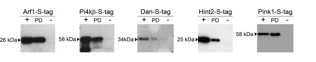 Fig. 2 GST-pulldowns. GST pulldowns were performed to validate NCS-1/NBP interactions. A human NCS-1-GST fusion protein was used to pull down S-tagged zebrafish NBPs. In each panel, the left (+) lane contains a bacterial lysate expressing the designated S-tagged NBP, the middle lane (PD), contains NBPs pulled down from bacterial lysates after incubation with the NCS-1-GST fusion protein, and the right lane (-) shows proteins pulled down from lysates after incubation with GST alone. Blots were probed with an HRP-conjugated S-tag antibody to detect each S-tagged NBP. Molecular weights (kDa) of S-tagged NPB fragments are indicated to the left of each panel.
