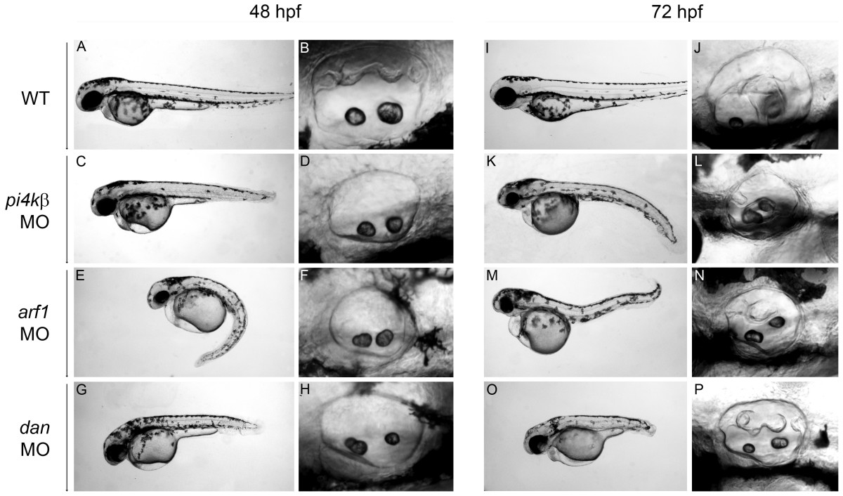 Fig. 3 Knockdown of arf-1, pi4kβ, and dan mRNA expression. Antisense MOs targeted against arf-1, pi4kβ, or dan mRNA were injected into single cell embryos, and morphants analyzed at 48 (C-H) and 72 hpf (K-P). For comparison, control (buffer injected) embryos are shown at 48 (A-B) and 72 (I-J) hpf. Embryos were injected with either 4 ng pi4kβ-ATG MO (C-D, K-L), 2 ng arf1-UTR MO (E-F, M-N), or 1ng of dan-ATG MO (G-H, O-P). Images of otic vesicle (B, D, F, H, J, L, N, P) are all lateral views with anterior to the left. Lateral views of wild-type embryos are shown at 48 (A) and 72 (I) hpf. Lateral views of morphant embryos are shown at 48 (C, E, G) and 72 (K, M, O) hpf.