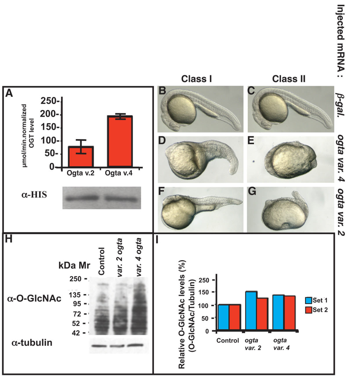 Fig. 5 Variant 2 and variant 4 Ogta proteins are active in vitro and in vivo. (A) in vitro Ogt activity assay of bacterially expressed, HIS-tagged variant 2 Ogta and variant 4 Ogta proteins. Both enzymes incorporate significant amounts of [3H]UDP-GlcNAc onto the synthetic CKII peptide identical to the human sequence, although variant 4 Ogta is more active than variant 2. A western blot of the bacterial lysates reveals that equivalent amounts of enzyme were added to the reactions. (B-G) Images of live 24 hpf embryos injected with 500 pg β-galactosidase mRNA (B, C), variant 4 ogta mRNA (D, E), or variant 2 ogt (F, G). Embryos injected with β-galactosidase mRNA developed normally (B, C). Overexpression of variant 4 ogta mRNA resulted in three phenotypic classes of embryos at this stage. Class I embryos had a visible, but shortened, body axis and reduced brain, including reduced or absent eyes (D). The body axis in Class II embryos was strongly reduced and in many cases, not discernable (E). Class III embryos are indistinguishable from wild type (not shown). Expression of variant 2 ogta mRNA produced the same range of phenotypes, including Class I (F) and Class II (G) embryos. (H, I) Western blot of protein extracts of 18 hpf embryos injected with 500 pg mRNA encoding β-galactosidase (lane 1), variant 2 ogta (lane 2), variant 4 ogta (lane 3). The blot was probed with the RL2 antibody, which recognizes the O-GlcNAc modification. This experiment was performed in biological duplicate (I) Quantification of the blot shown in (H, set 1) and a technical duplicate (set 2). B and C are duplicate images of the same control embryo.