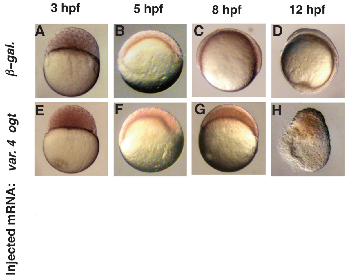 Fig. 9 Epiboly is delayed in Ogt expressing embryos. A live time-course embryonic development of an embryo injected with β-galactosidase mRNA (A-D) or a sibling injected with encoding variant 4 ogt mRNA (E-H) at 3 hpf (A, E), 5 hpf (B, F), 8 hpf (C, G) and 12 hpf (D, H). Progression through the cleavage stages in ogt overexpressing embryos (E) is indistinguishable from controls (E). Epiboly initiates normally when Ogt is overexpressed, and these embryos reach 40% epiboly at 5 hpf (B), the same as controls (F). Ogt overexpressing embryos are stalled at 40% epiboly at 8 hpf (G), when controls are at 75% epiboly (G). Control embryos complete epiboly at 10 hpf and reach the 3 somite stage at 12 hpf (D). The most severely affected Ogt overexpressing embryos never complete epiboly and begin to degenerate at 12 hpf (H).