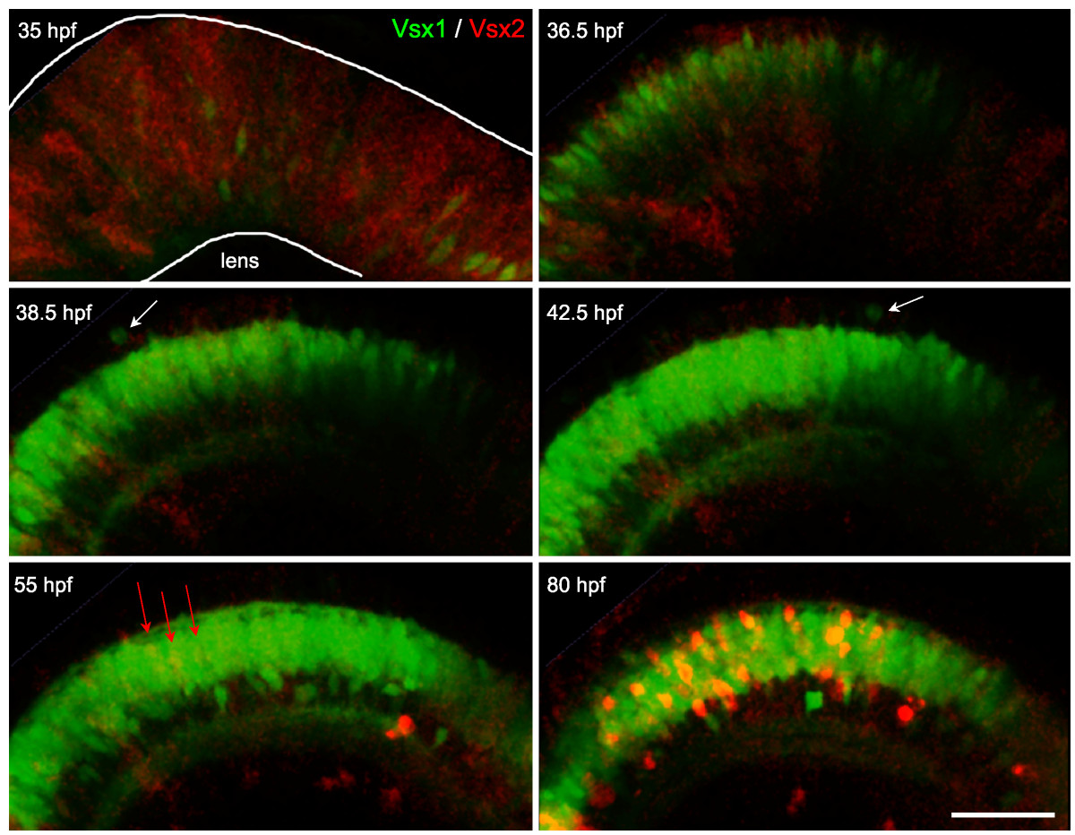Fig. 6 Vsx2/Vsx1 down-/upregulation, followed by Vsx2 upregulation. Time-lapse images from Additional file 3 of a double transgenic Tg(vsx1:GFP; vsx2:dsRed) embryo. Vsx2 is initially expressed in the majority of progenitors in the developing neuroepithelium and becomes downregulated in cells that upregulate Vsx1. These cells continue to undergo cell divisions at the apical surface (white arrows) and start differentiating around 40 hours post-fertilization (hpf). Later (around 55 hpf), a subpopulation of cells starts upregulating the expression of Vsx2:DsRed (red arrows) and then differentiates in the inner nuclear layer. Scale bar: 500 μm.