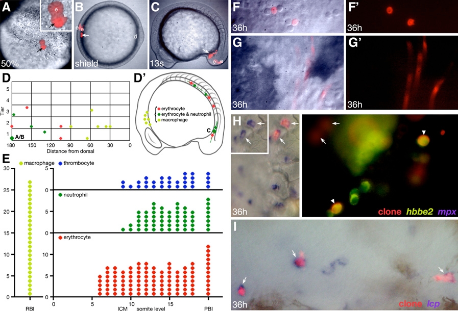 (A–G′) (A–C and F–G) Progeny of a single mid-blastula- labeled cell. (A) The clone at 50% epiboly (face view), now one deep cell (arrow) and two EVLs (e) at the margin of the blastoderm; note that the single deep cell is being viewed through one of the EVL cells. (B) The clone at the shield stage (animal pole view), now two deep cells (arrow) and two EVLs (e) located 180° of arc from the dorsal midline (d). (C) The clone at the 13-somite stage (side view), now 11 deep cells (arrow) in the posterior IMC. The EVL portion of the clone (e), now periderm, is extraembryonic. (F and G) The clone at 36 hr, now endothelial cells and circulating blood, which include (F) neutrophils and (G) erythrocytes. (D and D′) Hematopoietic fate maps. Graphs depict the location of the same clones at two different stages of development. (D) 6 hr gastrula fate map, clones versus dorsoventral location. The presentation is a side view; dorsal is oriented toward the right, with clones on the right projected to the left. Each symbol is the average location of the deep cell portion of a clone relative to the margin (tier 0), in units of cell diameter, and the dorsal midline (0), in degrees of arc. The oversized symbol represents the clone shown in (A)–(C), and the small letters refer to the respective panel. (D′) 16 hr 14-somite stage fate map, clones versus primitive blood island. The horizontal line through each symbol shows the anteroposterior spread of each clone. All clones except one also included endothelial cells. (E) 24 hr hematopoietic fate map, fate of clone versus anteroposterior location (RBI, somite level within the ICM, or PBI). Each symbol represents a single clone at that anteroposterior location; however, clones that spread over several somite levels are represented with multiple symbols. The fate map is based on 27 macrophage clones, 41 erythrocyte clones, 16 neutrophil clones, and 12 thrombocyte clones. These clones include all that were later verified by in situ hybridization.