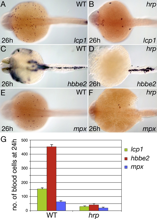 (G) The approximate number of blood cells found at 24 hr. Error bars show SEM. For each blood type, a total of ten or more wild-type and mutant embryos were counted.