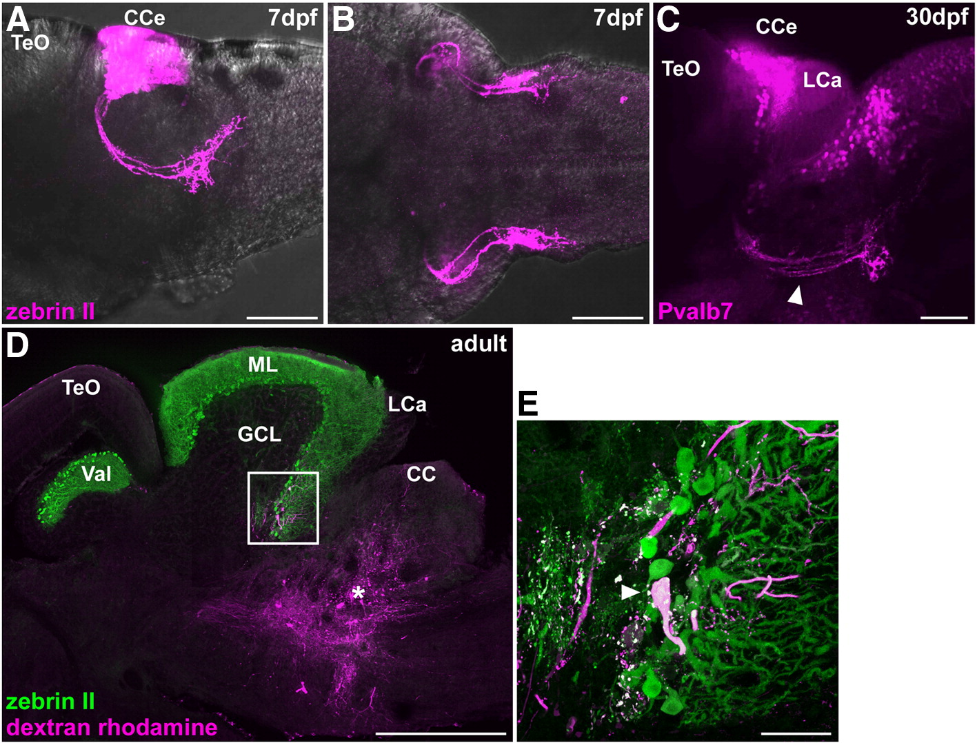 Fig. 8 Cerebellovestibular tracts. (A, B) Immunostaining of 7 dpf larval brains with zebrin II. Lateral (A) and ventral (B) views with anterior to the left. (C) Immunostaining of a 30 dpf juvenile fish brain with anti-Pvalb7 antibody. Lateral view with anterior to the left. Cerebellovestibular tracts are indicated by arrowhead. (D, E) Retrograde labeling of cerebellovestibular tracts. A biotin-conjugated neural tracer was injected to the vestibular region (asterisk, D), which includes the descending octaval nucleus, of adult fish. A sagittal section was stained with zebrin II (green) and fluorescently labeled avidin (magenta). (E) High-magnification view of the box in (D). Note that a retrogradely labeled cell is a zebrin II+ Purkinje cell. The abbreviations are described in Fig. 1. Scale bars: 500 μm (D), 100 μm (A–C) and 50 μm (E).