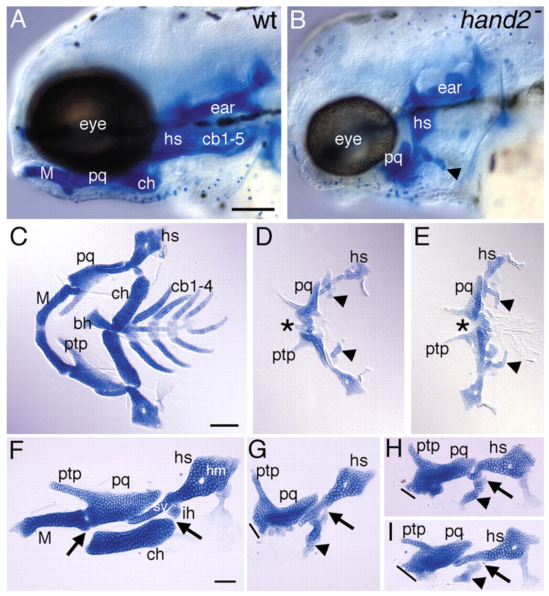 Fig. 6 hand2 is required for ventral pharyngeal cartilage and the jaw joint but not for the second arch joint. (A,B) Lateral views of wholemount 4-day old wild type (A) and hand2 mutant (B) larvae stained with Alcian Green, revealing severe loss of ventral pharyngeal cartilage in the mutant. (C-I) Flat-mounted pharyngeal cartilages from wild type (C,F) and hand2 mutants (D,E,G-I). (C-E) Flat-mounted pharyngeal cartilages from the first six arches in wild type (C), and the entire pharynx in two different hand2 mutants (D,E). In hand2 mutants, ventral cartilages (arrowheads) are severely reduced. The two upper jaws are connected by a continuous cartilaginous bridge (asterisk), although some hints of partial jaw joint formation are evident (see Table 2). Branchial cartilages are also absent in hand2 mutants. The upper hyomandibular region of the hyosymplectic in E was slightly nicked during dissection and resembled the contralateral counterpart. (F-I) Flat-mounted pharyngeal cartilages from one side of the first and second arches. The prominent ventral cartilages (M, ch) present in wild type (F) are absent in hand2 mutants, although a small jumbled mass of ventral second arch cartilage is invariably present (arrowheads, see Table 2). (G-I). The dorsal cartilages are relatively well patterned with distinctive PTP and SY elements visible. The second arch joint (arrows) is present in hand2 mutants. Because of the highly penetrant jaw joint loss (see Table 2), the hand2 mutants in G-I were cut during dissection in order to flat-mount; the line indicates the plane of cutting and where the upper jaw was fused to its contralateral counterpart (asterisk in D,E). bh, basihyal; cb1-4, ceratobranchial 1-4; ch, ceratohyal; hm, hyomandibula; hs, hyosymplectic; ih, interhyal; M, Meckel′s; pq, palatoquadrate; ptp, pterygoid process of palatoquadrate; sy, symplectic. Scale bars: 100 μm in A-E, 50 μm in F-I.