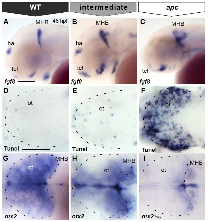 Fig. S3 Misexpression of apc-GFP mRNA in apc mutants results in various degrees of phenotypic rescue. (A–C) Lateral view. (D–I) Dorsal view, with eyes removed in (G–I). Anterior to the left. All embryos at 48 hpf. Phenotypes of fgf8 expression (A–C), apoptosis (D–F) and otx2 expression (G–I) as categorized in Figs. 6A and 8H, I. Wild-type or completely rescued apc-GFP injected mutant embryos show normal expression domains of fgf8 at the MHB, habenula (ha) and telencephalon (A), virtually no apoptosis in the tectum (D) and otx2 expression throughout the tectum (G). In partially rescued embryos, fgf8 expression is restored at the habenula and telencephalon, but is still expanded at the MHB (B), similarly to control mutants (C). Partially rescued mutants show a much improved cell survival as compared to the apc phenotype (F). However, there is still a low level of apoptosis in the tectum (E) as compared to the wild-type phenotype (D). otx2 expression is still slightly reduced in partially rescued mutants (H). ha, habenula; MHB, mid–hindbrain boundary; ot, optic tectum; tel, telencephalon. Scale bar 125 μm.