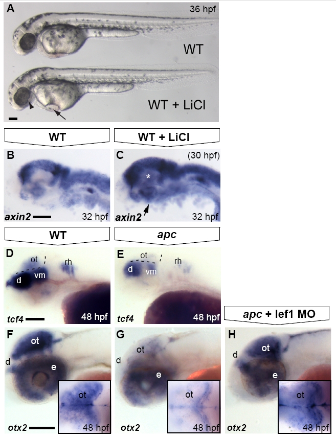 Fig. S4 Optic tectum phenotypes in apc mutants are mainly due to overactivated Wnt/β-catenin signalling. Lateral view. Anterior to the left. (A) LiCl treatments at late stages cause morphological defects in the eye (arrowhead), otic vesicles and heart (arrow) similar to the apc phenotype. (B, C) Upon late LiCl treatment at 30 hpf (C), the Wnt/β-catenin target gene axin2 is enhanced in the dorsal brain and induced in the ventral brain (n = 19; asterisk and arrow). (D, E). tcf4 is expressed in the OT of wild-types (D), whereas it is absent from the mutant tectum (n = 12; E) Dashed lines indicate MHB and ventral/dorsal midbrain boundary. (F–H) Loss of otx2 expression in the apc optic tectum is restored to near wild-type expression levels (H) upon Lef1 knockdown using 1 ng of lef1 MO (strong rescue in 50% of apc mutants; remaining mutants show weak induction; n = 23). Insets — dorsal view with eyes removed. d, diencephalon; e, eye; ot, optic tectum; rh, rhombomere; vm, ventral midbrain. Scale bar 125 μm.