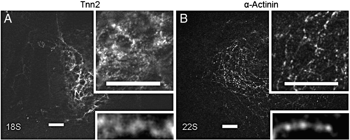 Fig. S2 Immunostaining for tnnt2 (A) and α-actinin (B) in the WT heart at early stages. At 18 S, tnnt2 appears as dotted pattern that associates with the thin filament network in perimembrane region. At 22 S, α-actinin dots start to be periodic, but show a shorter distance between two neighboring α-actinin dots than at 26 S. Insets are of the same image of higher magnification to reveal networks (at top), and a myofibril (at bottom). Scale bar = 20 μm.