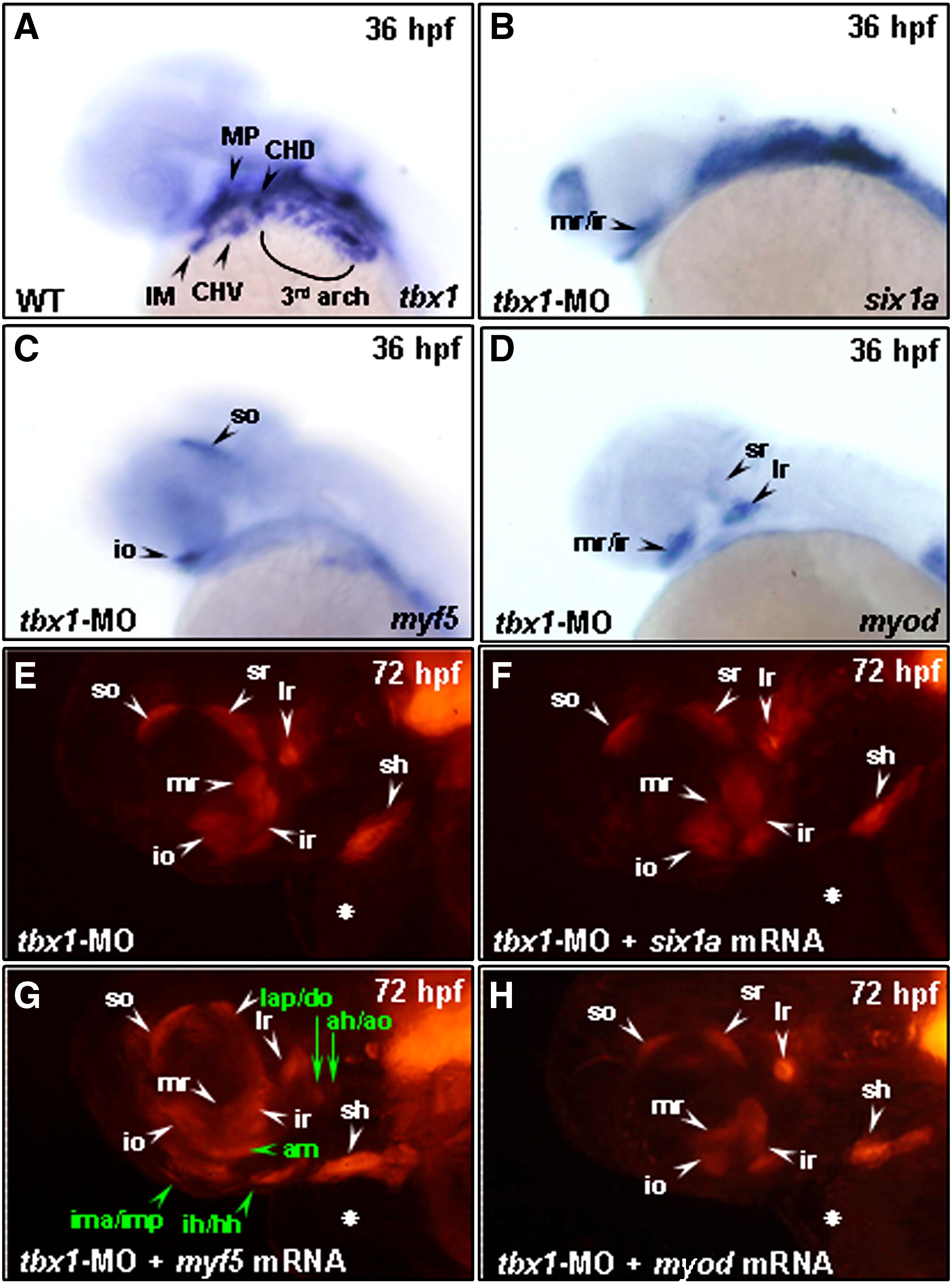 Fig. 6 The function of Six1a in branchial muscle development requires Tbx1 and Myf5 to play a specification role on arch muscle cell fate. Embryos derived from the wild-type strain (A–D) and from the transgenic line Tg(α-actin:RFP) (E–H) were examined at lateral view. Whole-mount in situ hybridization was used to detect the tbx1 expression in arch muscle and cranial mesoderm in wild-type embryos at 36 hpf (A). Compared to the above control embryos, the expressions of six1a (B), myf5 (C) and myod (D) in the 10 ng group of tbx1-MO-injected embryos were lost in arch muscles, but retained in extraocular muscles. We also observed that all the pharyngeal arch muscles were lost, but that 6 extraocular muscles developed normally in the 10 ng group of tbx1-MO-injected embryos derived from Tg(α-actin:RFP) at 72 hpf (E). With co-injection of 10 ng of tbx1-MO and either 150 pg of six1a mRNA (F), 100 pg of myf5 mRNA (G) or 50 pg of myod mRNA (H) in embryos, we found that only myf5 mRNA enabled embryos to rescue the RFP expression in lap, do, ah, ao, am, ima/imp and ih/hh (marked in green typeface of G). The heart defect induced by injection of tbx1-MO is labeled with a white star. ah, adductor hyoideus; am, adductor mandibulae; ao, adductor operculi; do, dilator operculi; hh, hyohyoideus; ih, interhyoideus; ima, intermandibularis anterior; imp, intermandibularis posterior; io, inferior oblique; ir, inferior rectus; lap, levator arcus palatini; lr, lateral rectus; mr, medial rectus; sh, sternohyoideus; so, superior oblique and sr, superior rectus. Embryos were all lateral views.