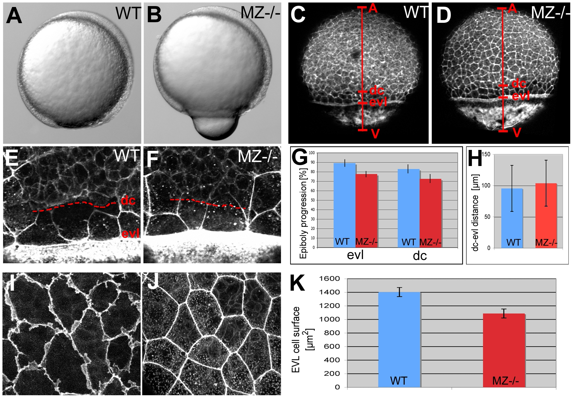 (A,B) Live animals at the 90% epiboly stage, dorsal to the right; (C–F,I,J) phalloidin stainings of the actin cytoskeleton at 80% epiboly. (A,B) One of the morphogenetic processes during epiboly is the constriction of marginal EVL cells [10]. In mutants, this constriction does occur, however, at aberrant, slightly more animal positions, leading to a protrusion of the yolk plaque (B). (C,D) Overview over entire embryos; red bars indicate the animal (A) - vegetal (V) axis, and the margins of the deep cell layers (dc) and the enveloping layer (evl). The mutant (D) displays slightly retarded epiboly of the EVL and the deep cells (see larger distances between the evl margin and the vegetal pole (evl-V) and between the dc margin and the vegetal pole (d-V) compared to wild-type control in C). (G) Graphic demonstration of average progression of evl and dc epiboly in MZ-/- mutants and wild-type controls (WT). Percentage values were calculated from images like in (C,D) as (distance A-evl)/(distance A-V) or (distance A-dc)/distance (A-V). Standard deviations are indicated. For exact numbers see Text S1. (E,F) Magnified views on the evl and dc margins; dc margins are indicated by dashed red lines. (H) Graphic demonstration of average evl-dc distances in MZ-/- mutants and WT controls, as shown in (E,F). n = 5; standard errors are indicated. (I,J) Magnified views on EVL in regions slightly animal of the deep cell border (merged Z-stacks of confocal images), revealing ruffle-like protrusions in the wild type (I) that are missing in the mutant (J). The presence of intracellular, vesicular-like phalloidin staining varied from embryo to embryo, and even from cell to cell, but seemed unrelated to the epcam genotype. (K) Graphic demonstration of average horizontal sizes of EVL cells of WT and MZ-/- embryos at 80% epiboly, as shown in (E,F). n = 30; standard errors are indicated.