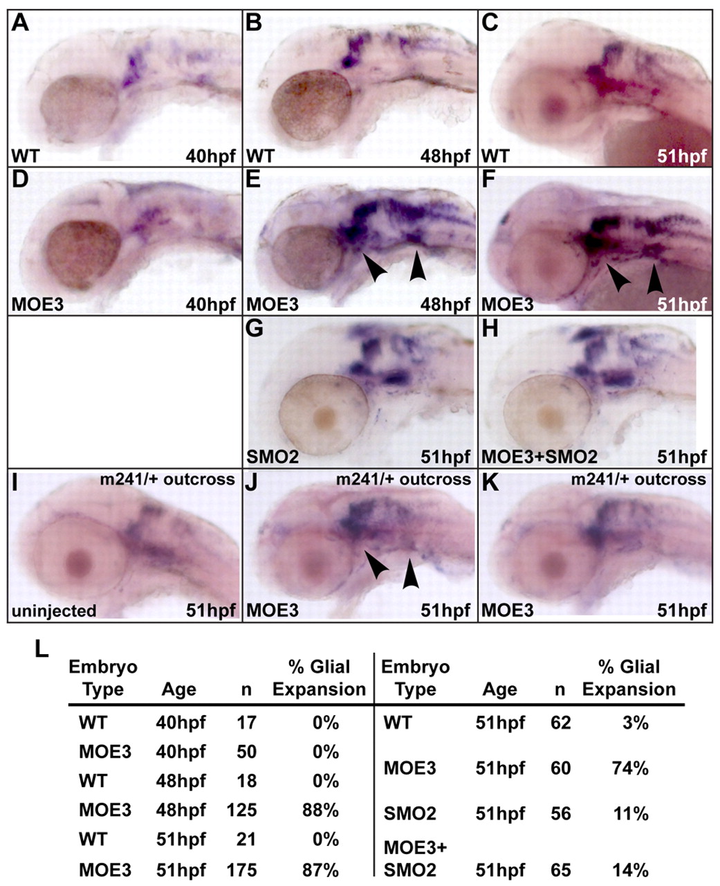 Fig. 8 Peripheral cranial glia populations were expanded in Disc1 morphants. (A-F) foxd3 expression, which marks the developing glia, was expanded at 48 hpf and 51 hpf, but not 40 hpf, in Disc1 morphants (arrowheads indicate enhanced expression in the trigeminal ganglion and the posterior lateral line ganglion). (G,H) Glial expansion was suppressed by SMO2 co-injection. (I-K) Glial expansion was also suppressed in 49% of Disc1 morphants from a sox10m241/+ by wild-type cross. Uninjected embryos (I; n=47) showed normal foxd3 expression, whereas Disc1 morphants (n=144) showed two distinct phenotypes, expanded (J, arrowheads) and normal (K) foxd3 expression, which probably correlates to their genotype (wild-type or heterozygous). (L) Table showing the percentage of Disc1 morphants with glial expansion (left) and suppression of expansion by SMO2 co-injection (right).