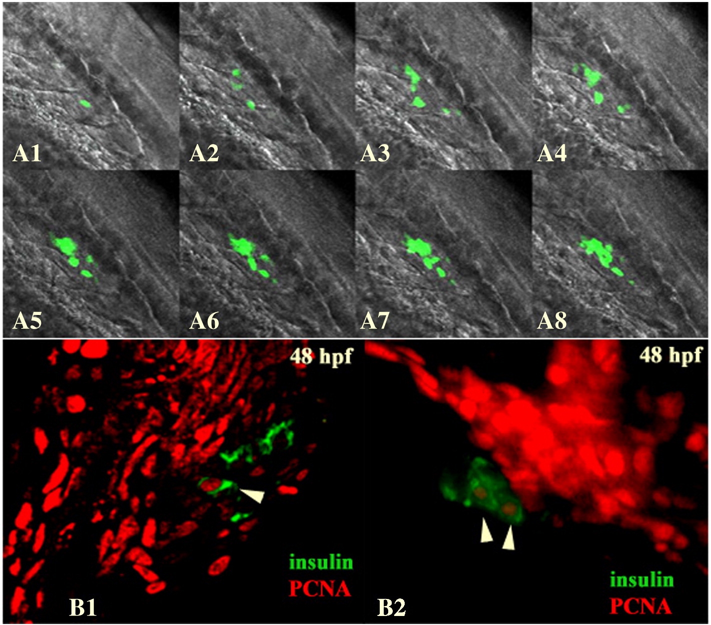Fig. 2 Generation of insulin-expressing beta cells during embryonic and larval stages. (A) Fig. A1 to A8 are projections of confocal stacks recorded every 30 min from a dorsal view of a representative 20–25 hpf ins:GFP transgenic embryo. The whole movie (39 stacks, 5 hrs) can be seen in the Supplemental Movie 1. (B1, B2) Immunofluorescence with a anti-PCNA (red) and anti-insulin (green) on 48 hpf larva. Proliferating beta cells are indicated by an arrowhead.