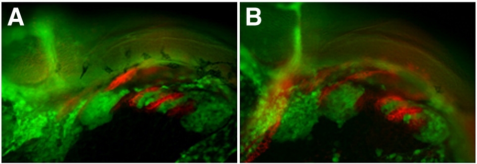 Fig. S8 Endodermal development following SU5402 treatment from 24–28 hpf. Lateral views, anterior to the left. (A,B) tg{fli1::eGFP} (green) embryo marking postmigratory CNCCs double labeled with the endoderm marker Zn-8 (red). (A) Control embryo treated from 24–28 hpf with DMSO shows normal arch and pharyngeal pouch development. (B) Embryo treated with SU5402 from 24–28 hpf shows reduced arches 3 and 4, as well as broad and less elongated posterior pharyngeal pouches as compared to DMSO treated control sibling.