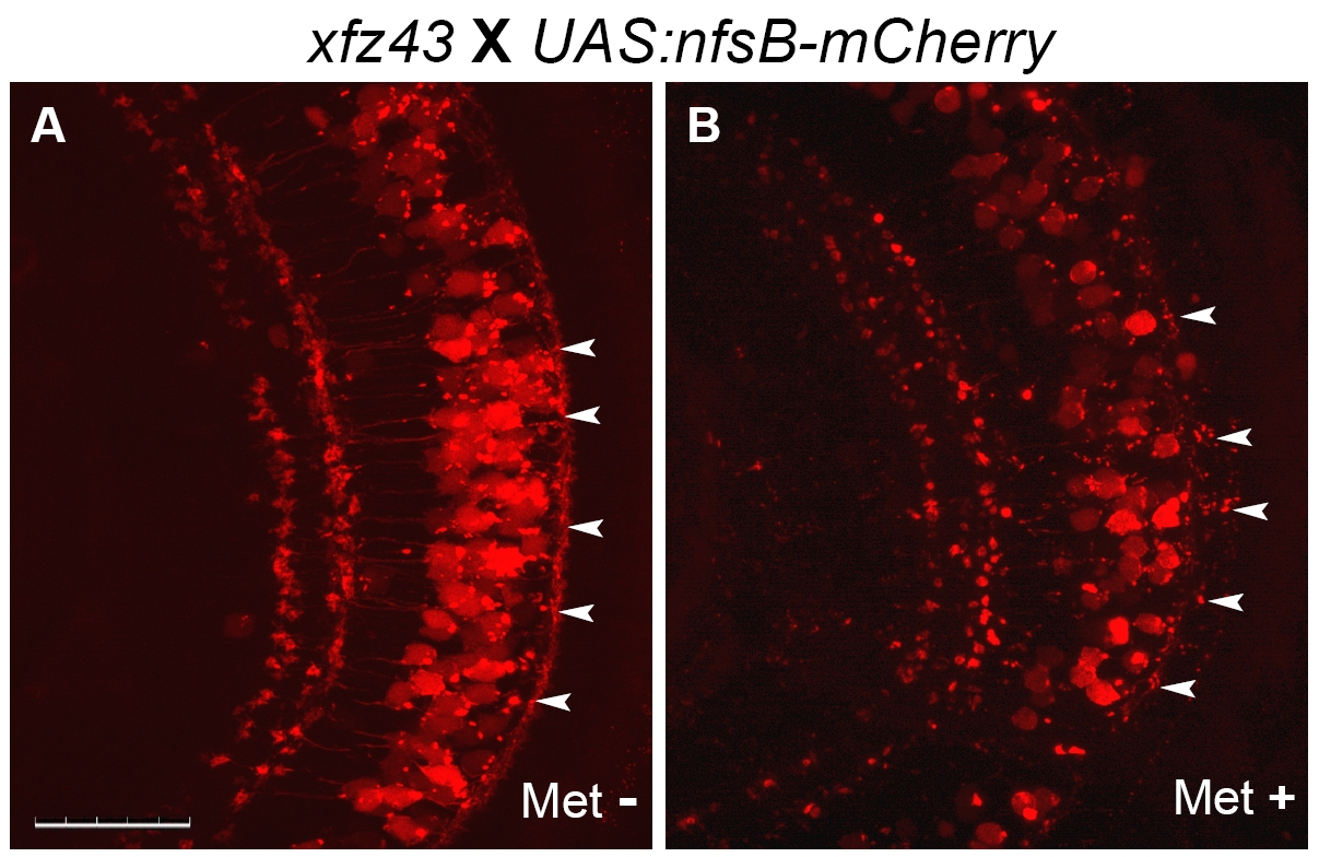 Fig. S4 Apoptotic cells in retina of prodrug treated larvae from the xfz43 x UAS:nfsB-mCherry mating. (A, B) Higher magnifications are shown for areas from Figure 7L, O, respectively. Retina from Met treated larva (B) show rounded NTR-mCherry labelled cells lacking axons. The axon termini in both the IPL and OPL (arrowheads) are also disintegrating. Scale bar: 25 μm.