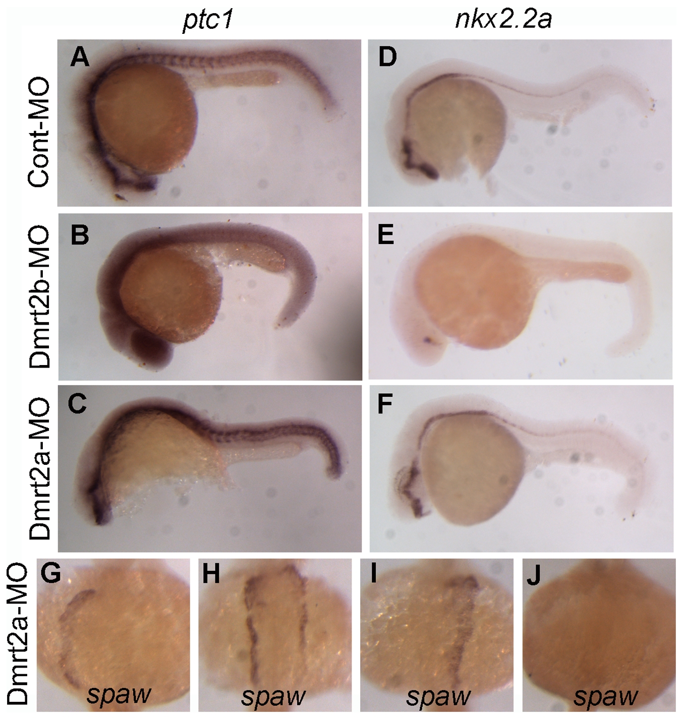 (A–C) The expression of ptc1 in embryos injected with Cont-MO, Dmrt2b-MO and Dmrt2a-MO at 24 hpf. (D–F) The expression of nkx2.2a in embryos injected with Cont-MO, Dmrt2b-MO and Dmrt2a-MO at 24 hpf. (G–J) spaw normal expression in left LPM at 20 somites stage were disrupted embryos injected with Dmrt2b-MO.