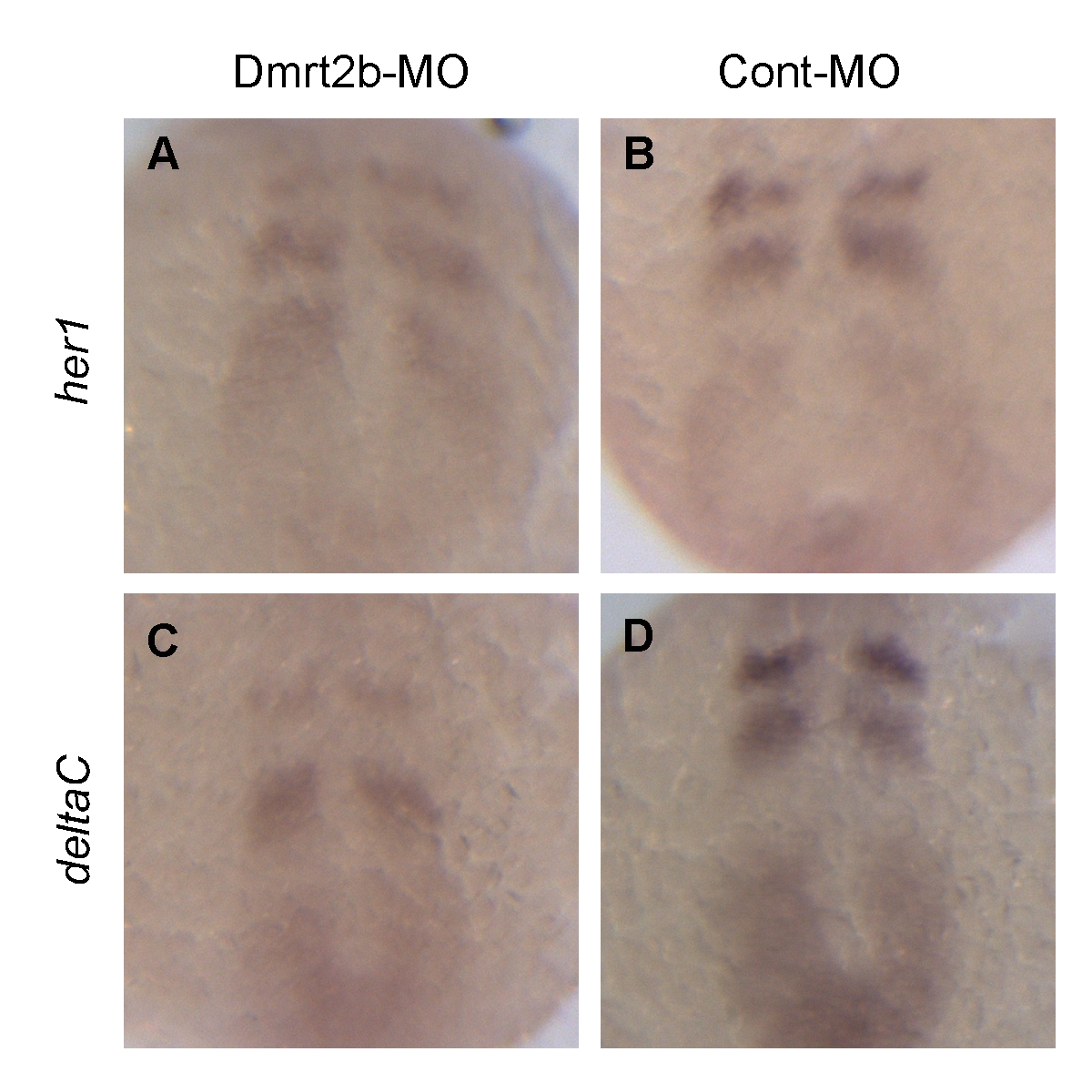 Fig. S3 Whole-mount in situ hybridization of persomitic mesoderm genes her1 and deltaC in the Dmrt2b morphants. Expression patterns of her1 in the Dmrt2b-MO (A) and Cont-MO (B) embryos. Expression patterns of deltaC in the Dmrt2b-MO (C) and Cont-MO (D) embryos. All the embryos are at 10 somites stage. Panels show dorsal views, anterior to the top.